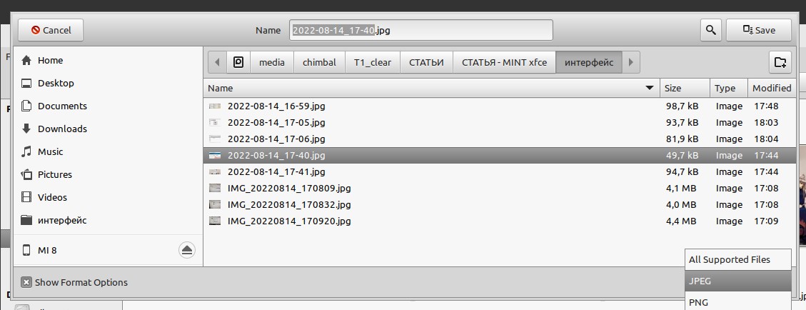 Следующая проблема это сохранение файлов, если нужно сохранить картинку в JPG формате, можно просто выбрать формат в правом нижнем углу окна, но вот проблема, если так сделать система выберет уже существующий в папке файл с расширением JPG и предложит его перезаписать, и так практически в любых приложениях...