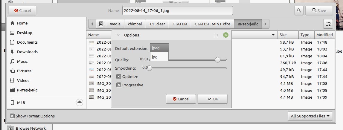 Но это еще не всё, после ручного исправления расширения файла всплывает окошко с настройками формата которое мне нужно, и в чем же тут проблема? В системах Microsoft Windows такие окна автоматически сфокусированы на кнопке "OK", но не в Linux Mint 21 Xfce Edition, тут фокус установлен на "Default extension", мне нужно мышкой тащить курсор на кнопку "OK" чтобы наконец сохранить файл.