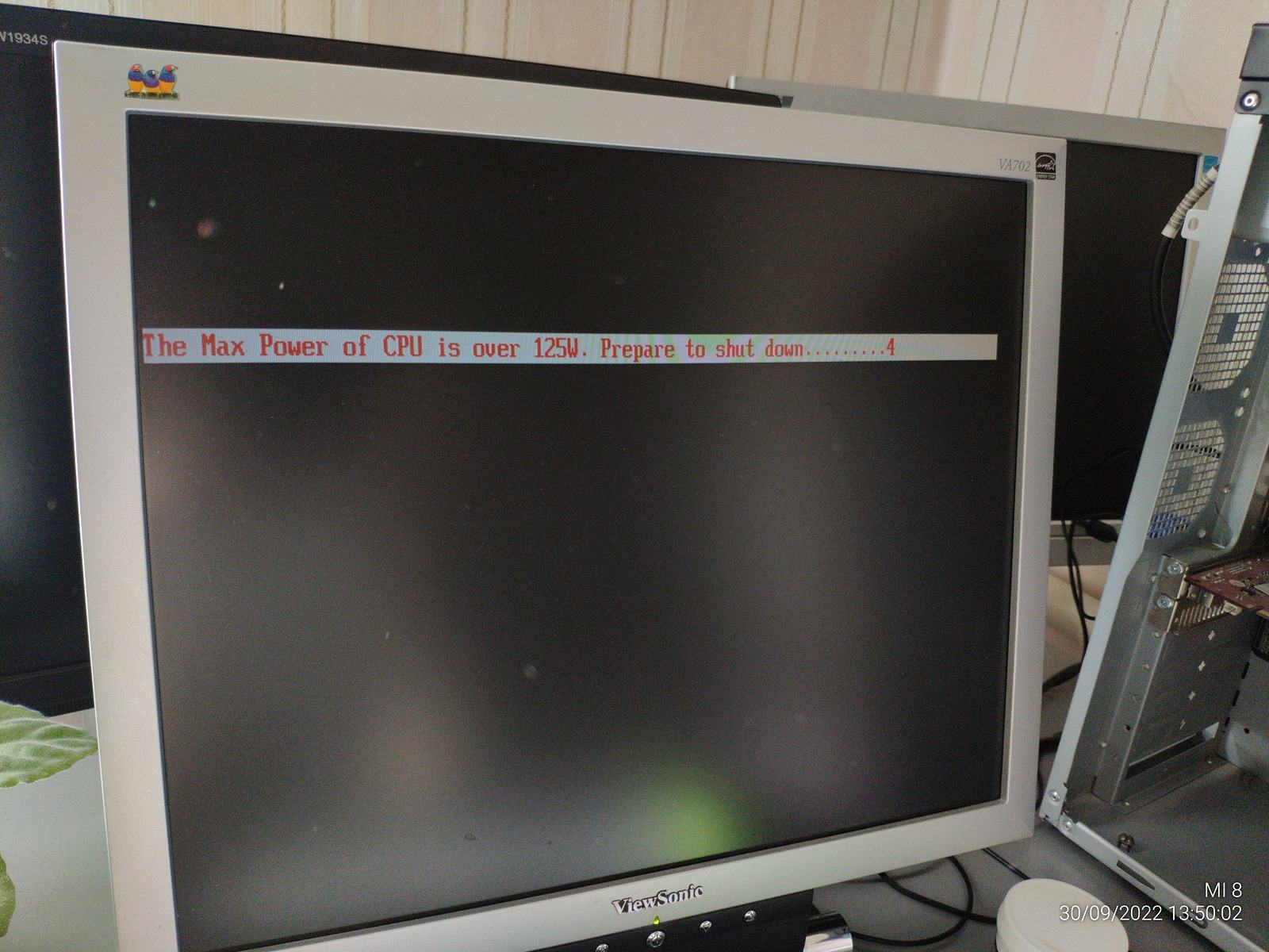 Батарейку CMOS конечно же следует заменить, а вот и основная проблема "The Max Power of CPU is over 125W. Prepare to shut down...", хотя процессор вроде как на 65 Вт заявлен...