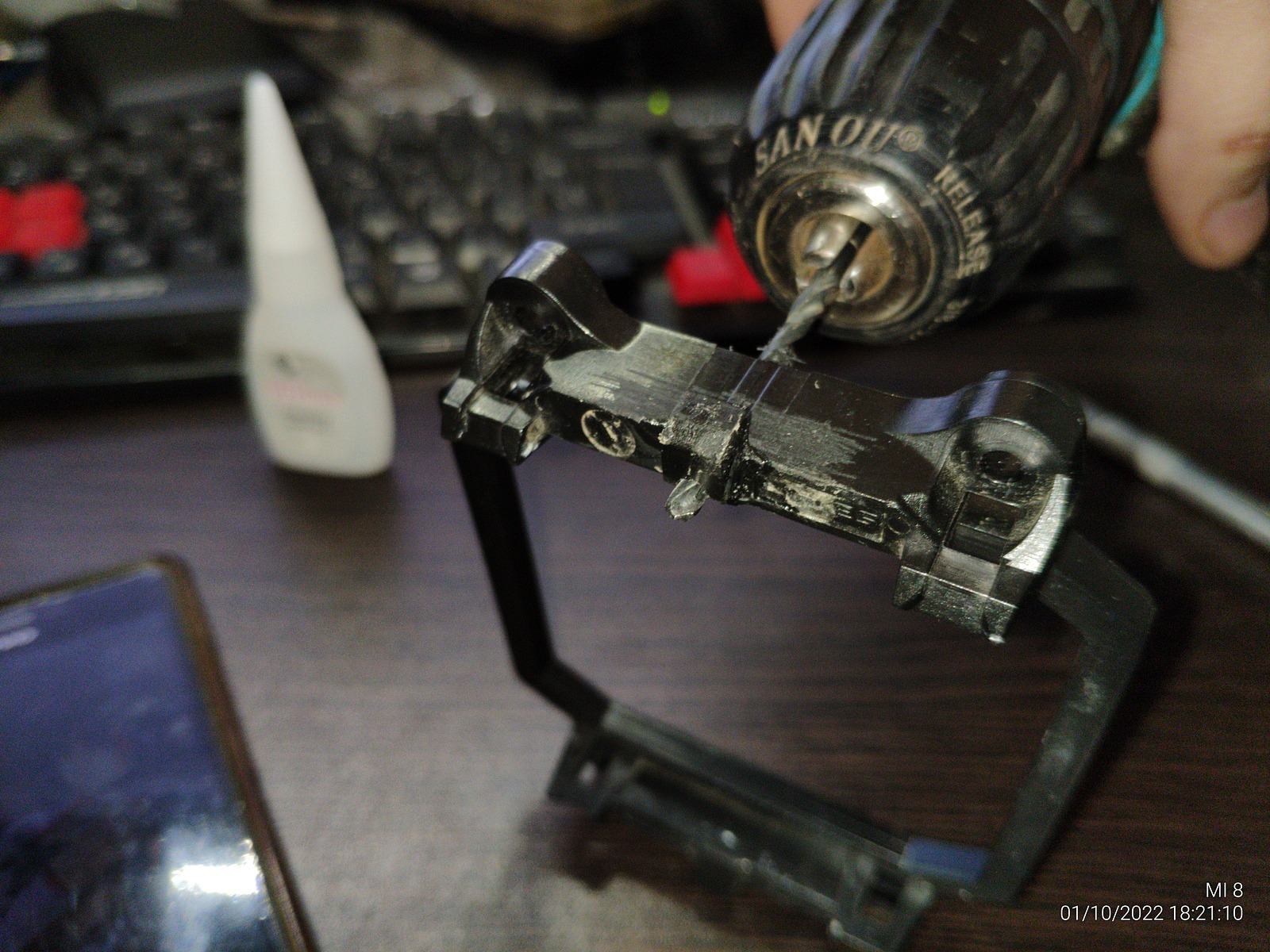 Так как в рамке уже было отверстие не до конца засверленное, было решено его досверлить и затянуть болтом, ибо один лишь клей точно не выдержит нагрузку от крепления системы охлаждения.