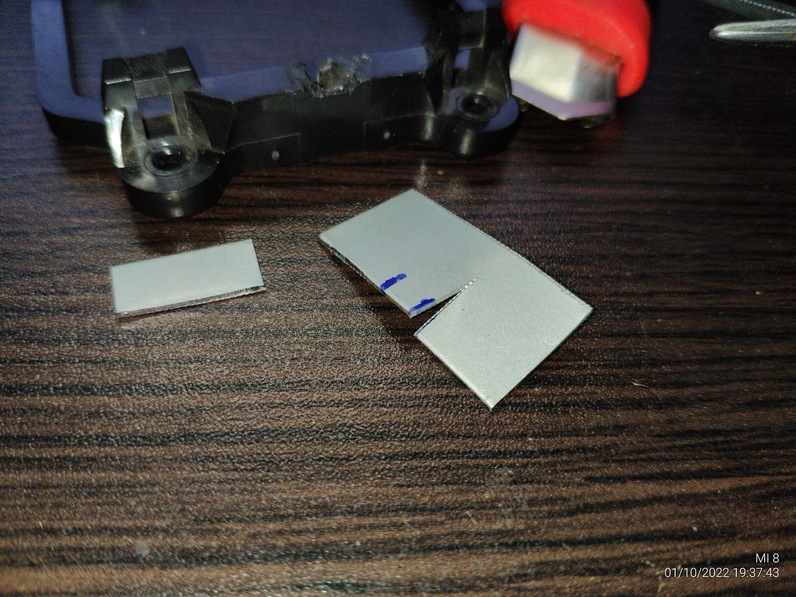 Был найден кусок толстого железа (~0.8 - 1 мм.), первая попытка провалилась, слишком сильно надавил на ножницы и отрезал больше чем нужно...