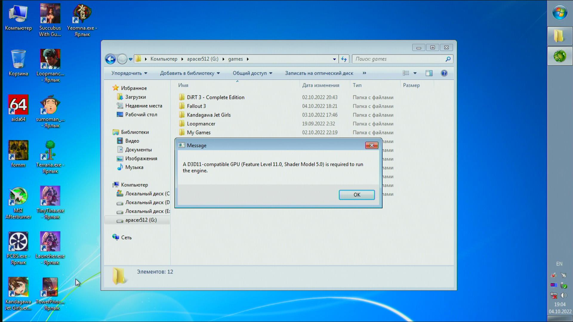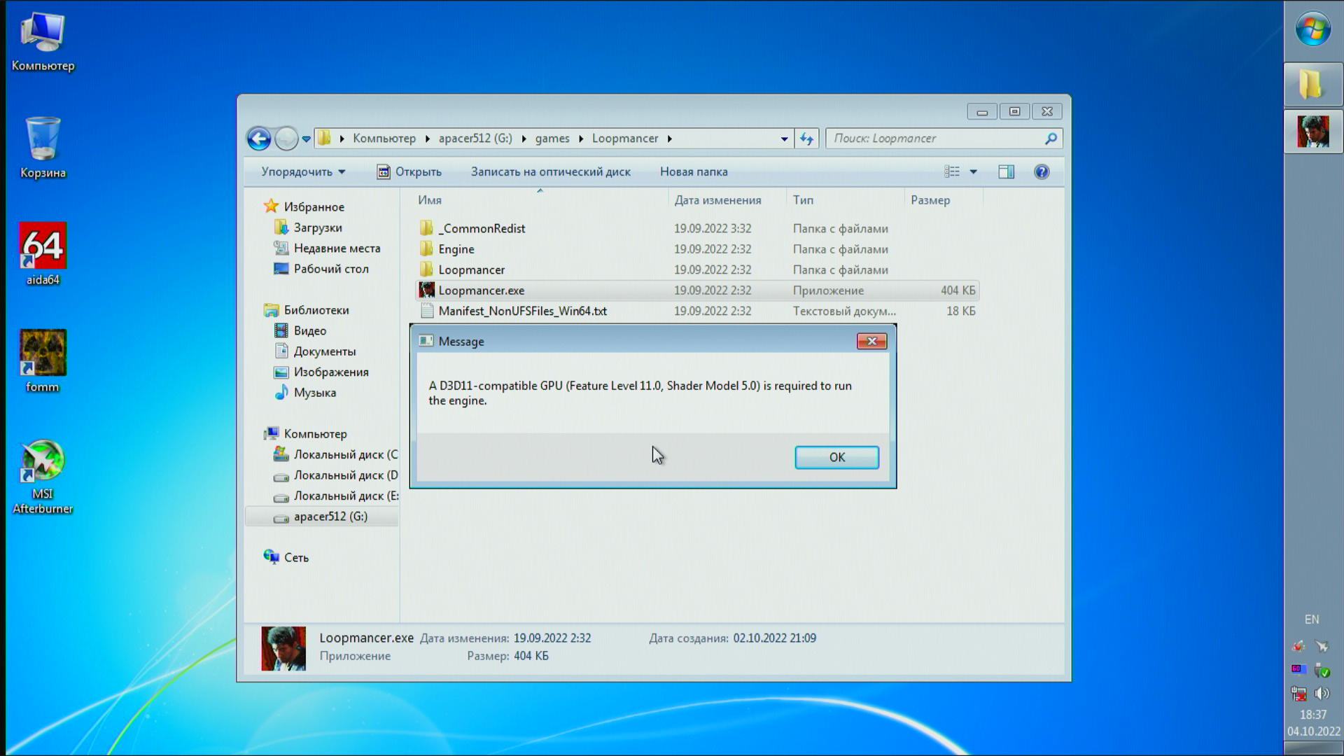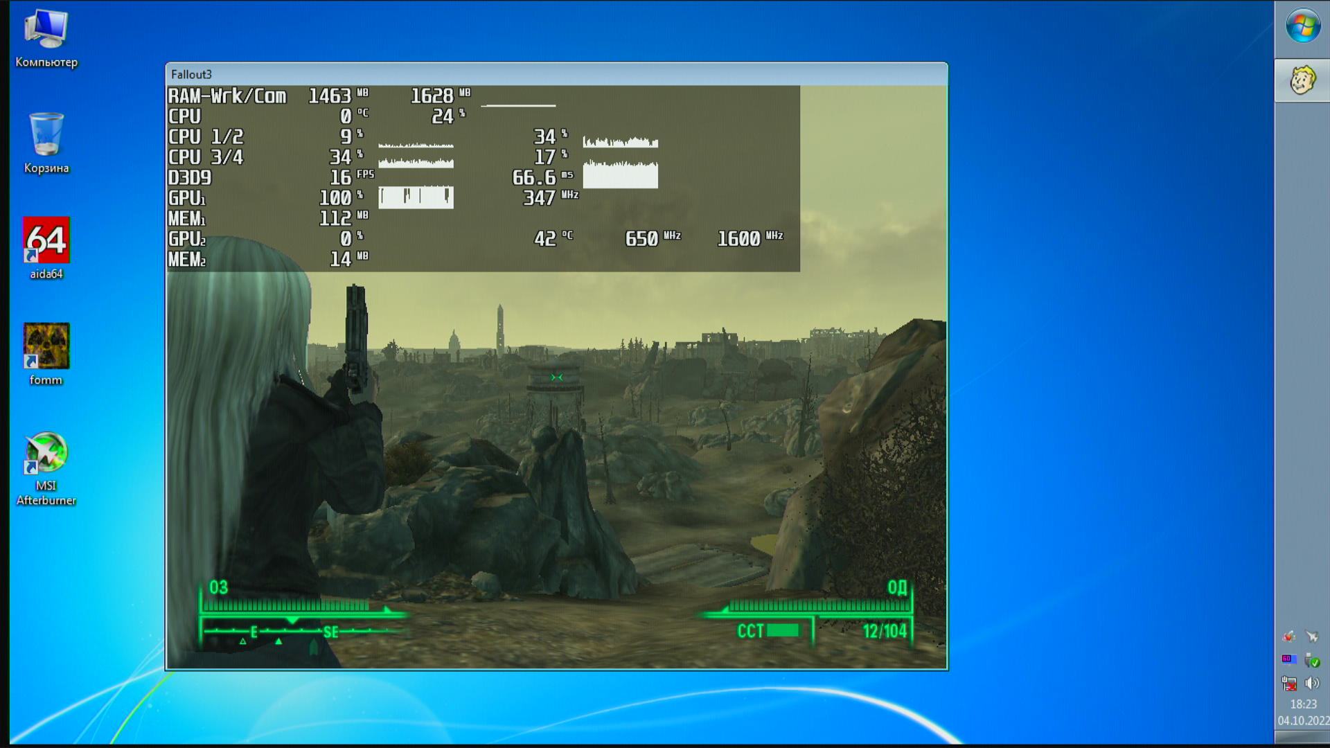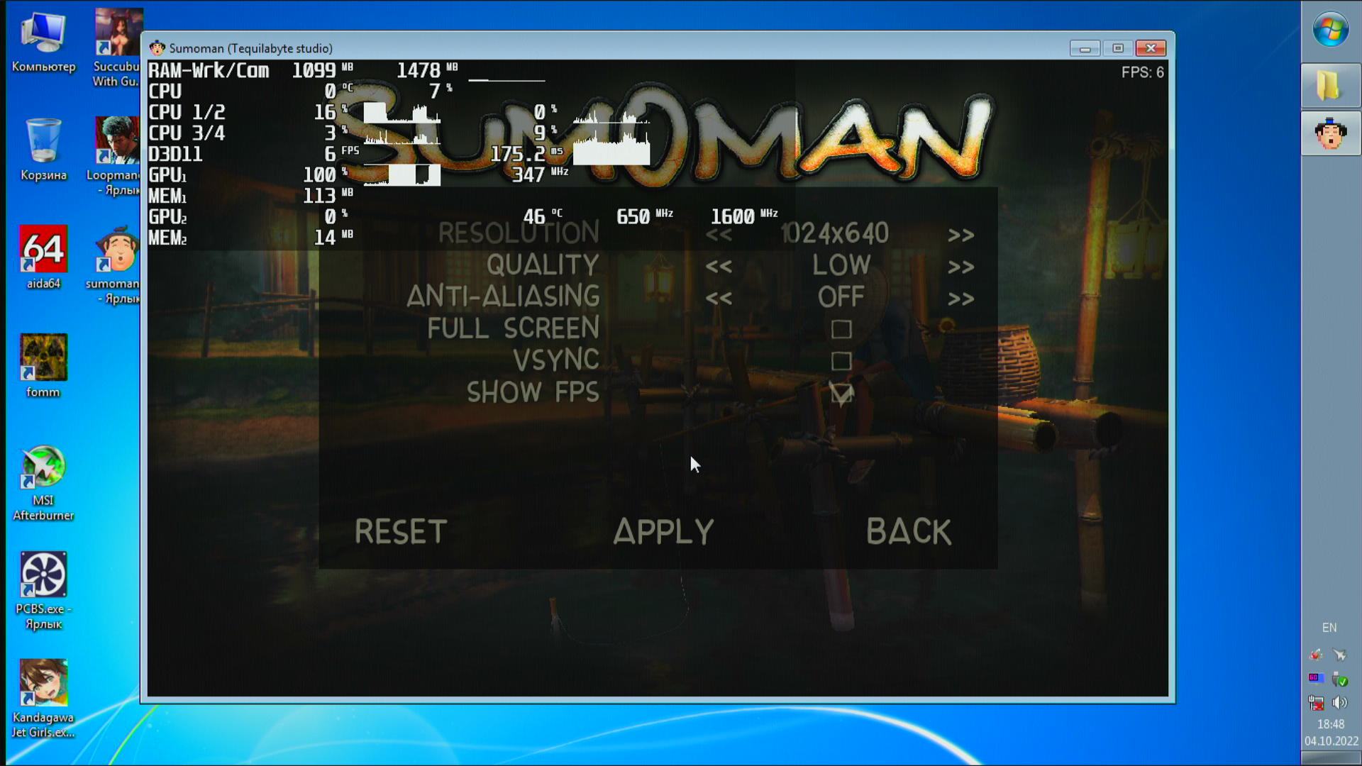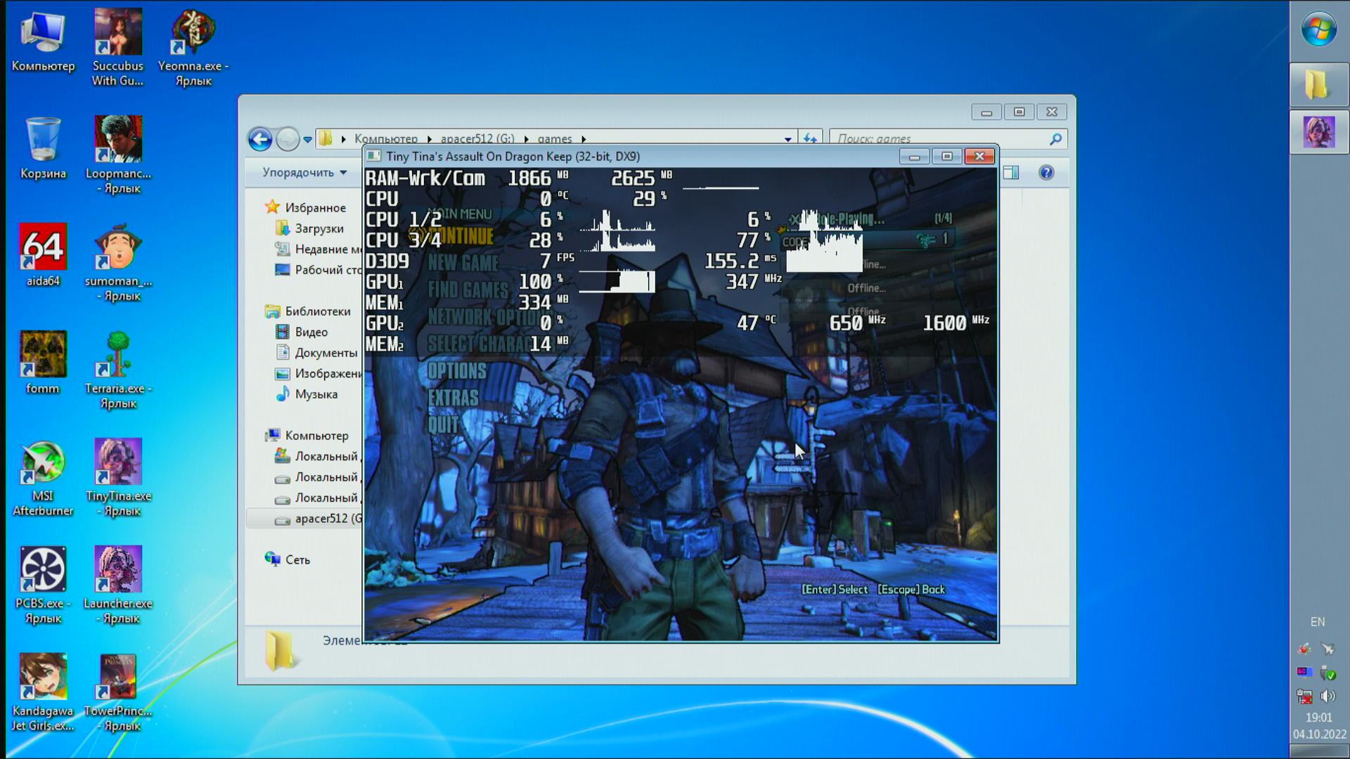 Далее я попытался запустить одну из игр, но видеокарта 9600 GT не умеет в DirectX 11, а потому игра лишь частично заработала, да, DX11 API, но изображения нет, только элементы меню видны, потому я решил немного настроить MSI Afterburner и Windows 7, отключить композитор рабочего стола чтобы не занимал лишнюю память видеокарты и не добавлял задержки ввода.