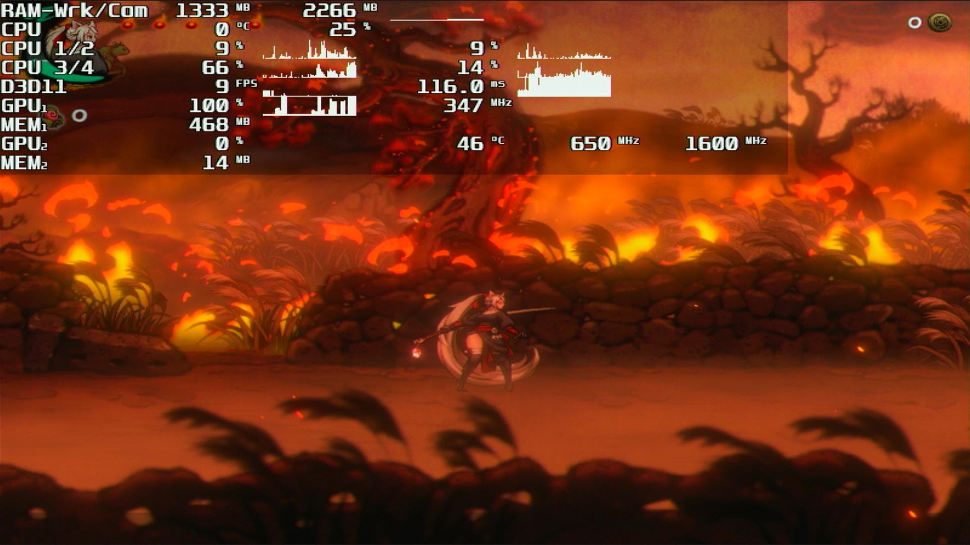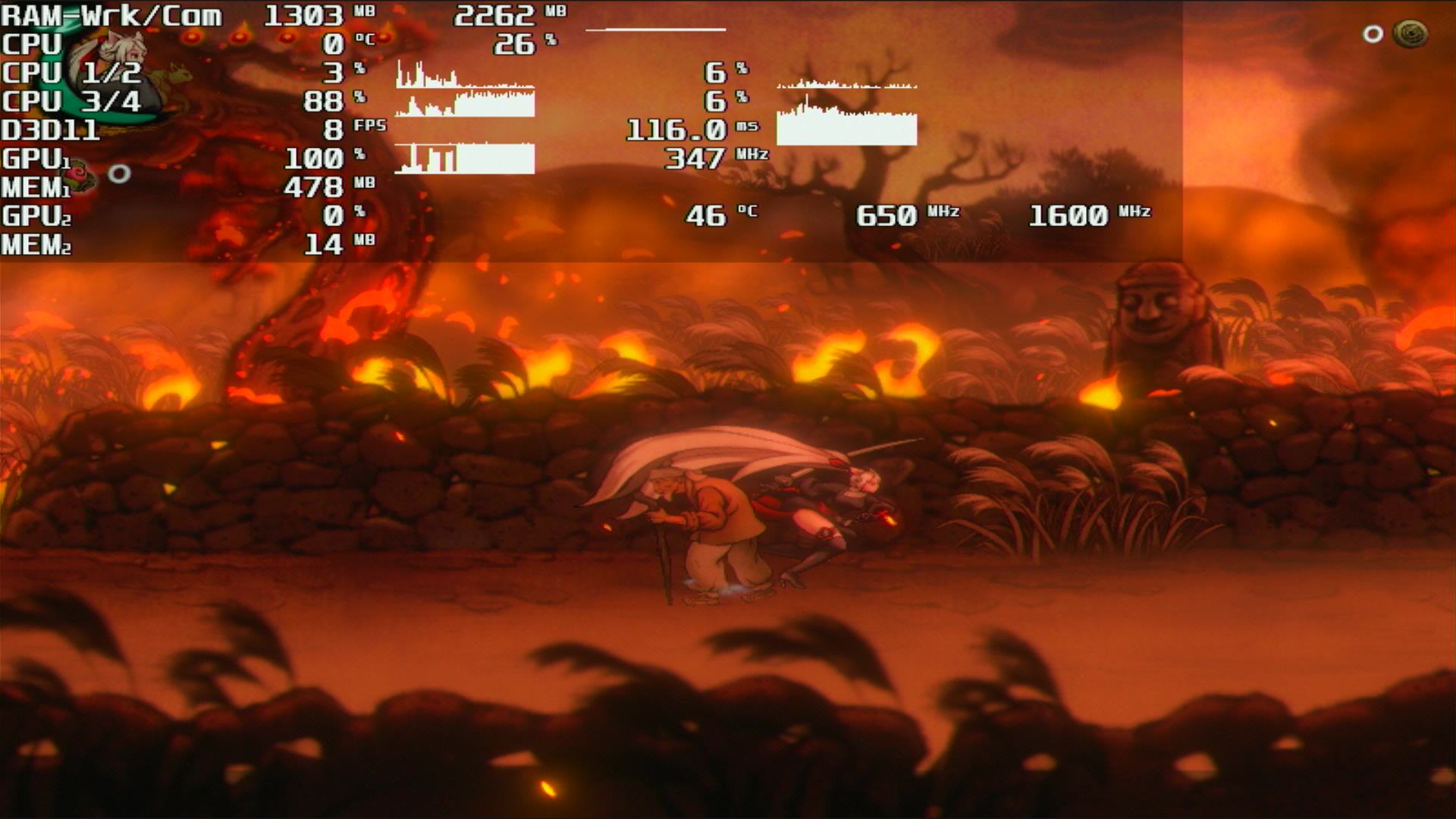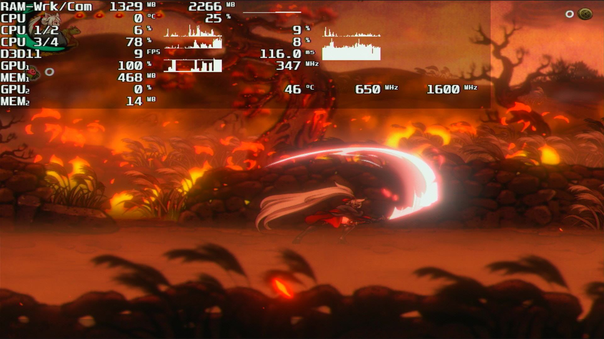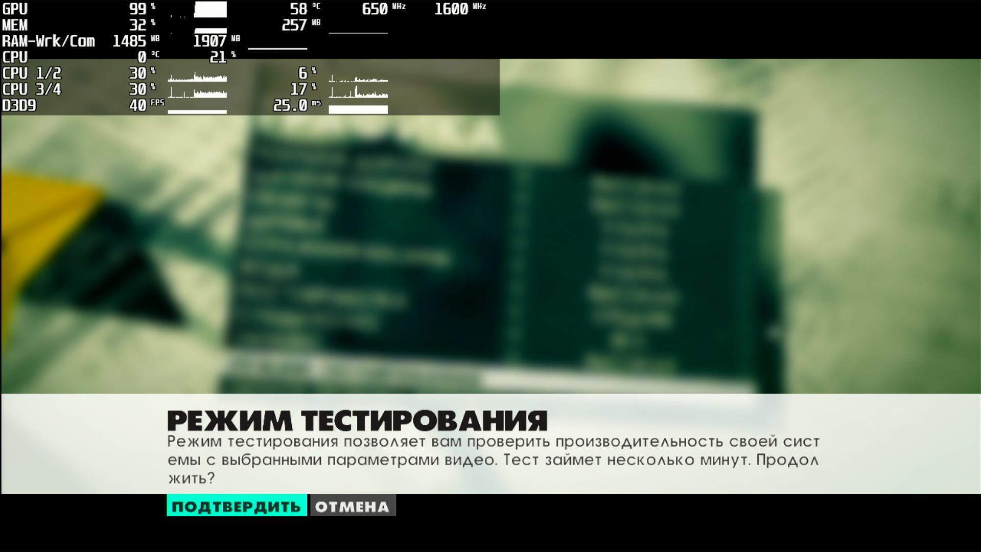А еще эта игра сильно подвержена влиянию мониторинга от MSI Afterburner и прочих системных фоновых процессов, в главном меню прекрасно видны острые пики на графике времени кадра и FPS.