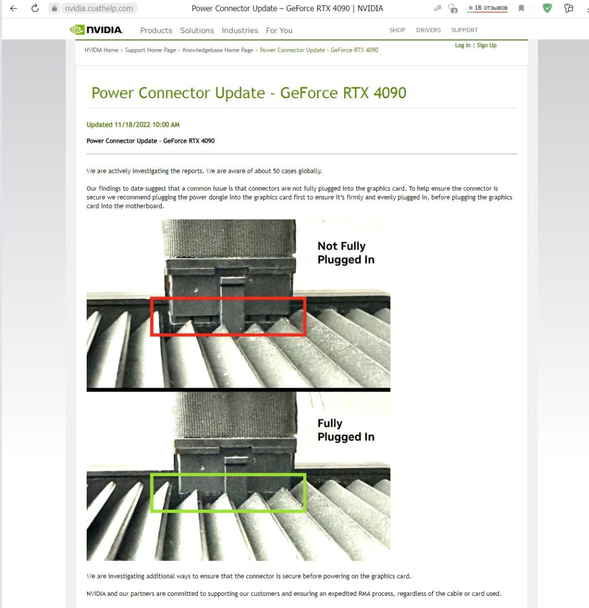 Конечно же NVIDIA не могла остаться в стороне, и во всём оказались виноваты пользователи которые "неправильно" подключали коннектор питания, видите ли, нужно сначала подключить питание к видеокарте, и только после этого вставлять видеокарту в ПК рассматривая под микроскопом до конца ли вставился "не проблемный" коннектор, правда непонятно что делать если коннектор физически не влазит до конца...