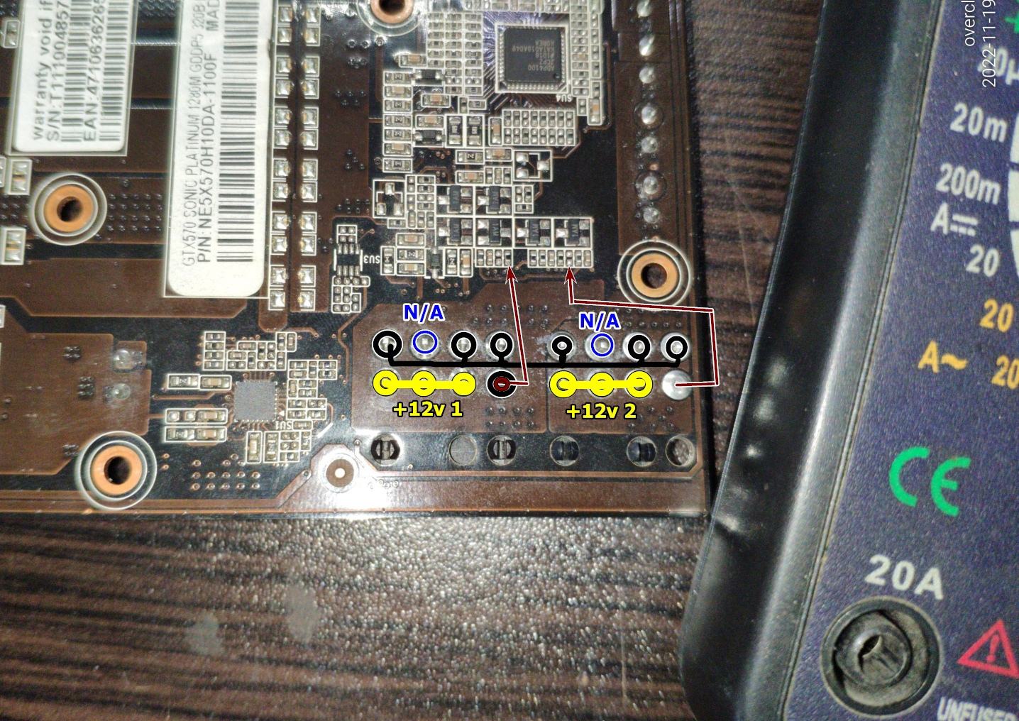 Теперь переходим к видеокарте, прежде всего я составил карту гнезд питания, один контакт из 8 Pin коннектора используют для мониторинга подключения видеокарты, контакты обозначенные как "N/A" я не смог найти на самой плате видеокарты, возможно они не задействованы никак.