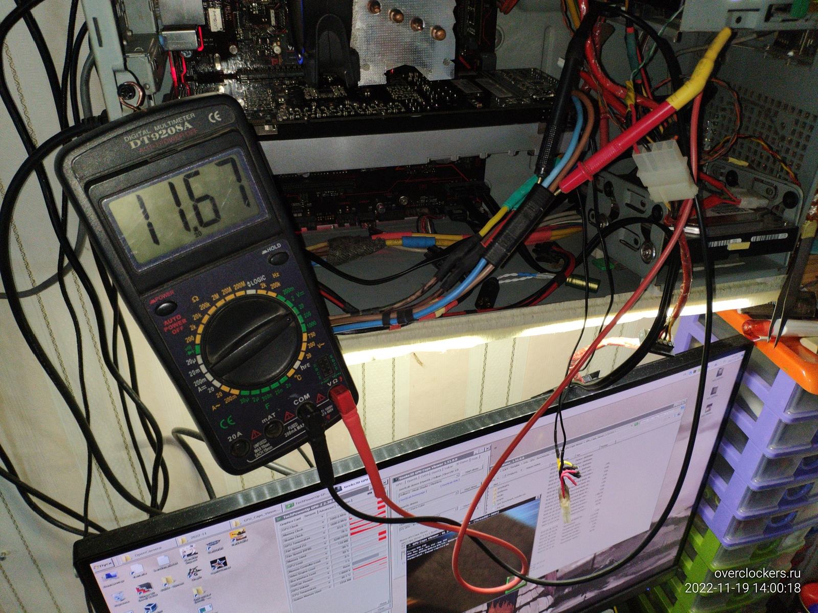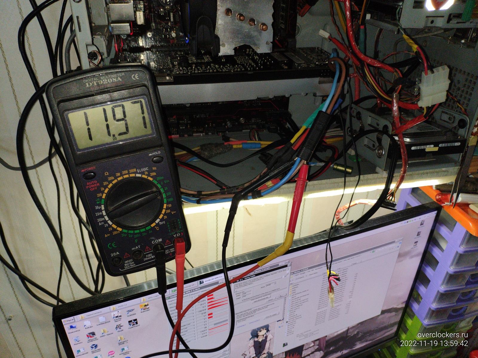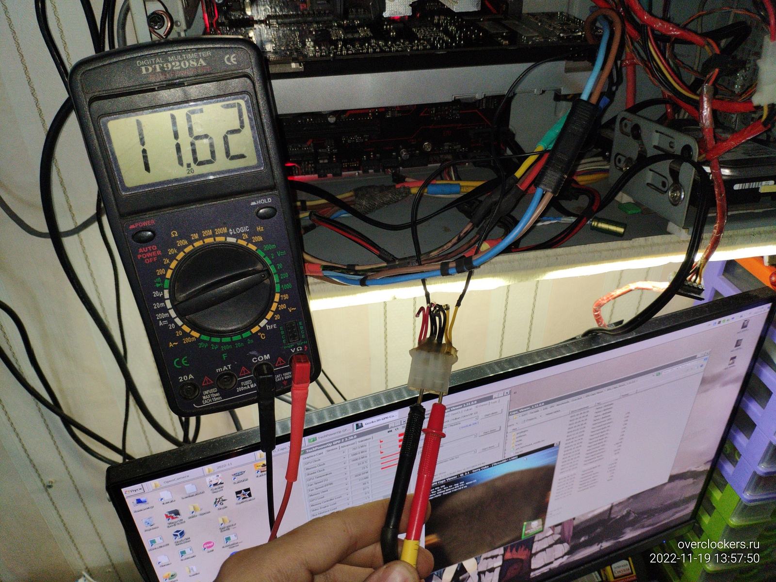 Настало время тестов, в простое напряжение 11.98в, при нагрузке перед коннектором MT60 напряжение снизилось до 11.75в, на самом блоке питания будет чуть выше напряжение за счет потерь на проводах до коннектора, но это не важно сейчас, важно что на видеокарту приходит 11.62в.