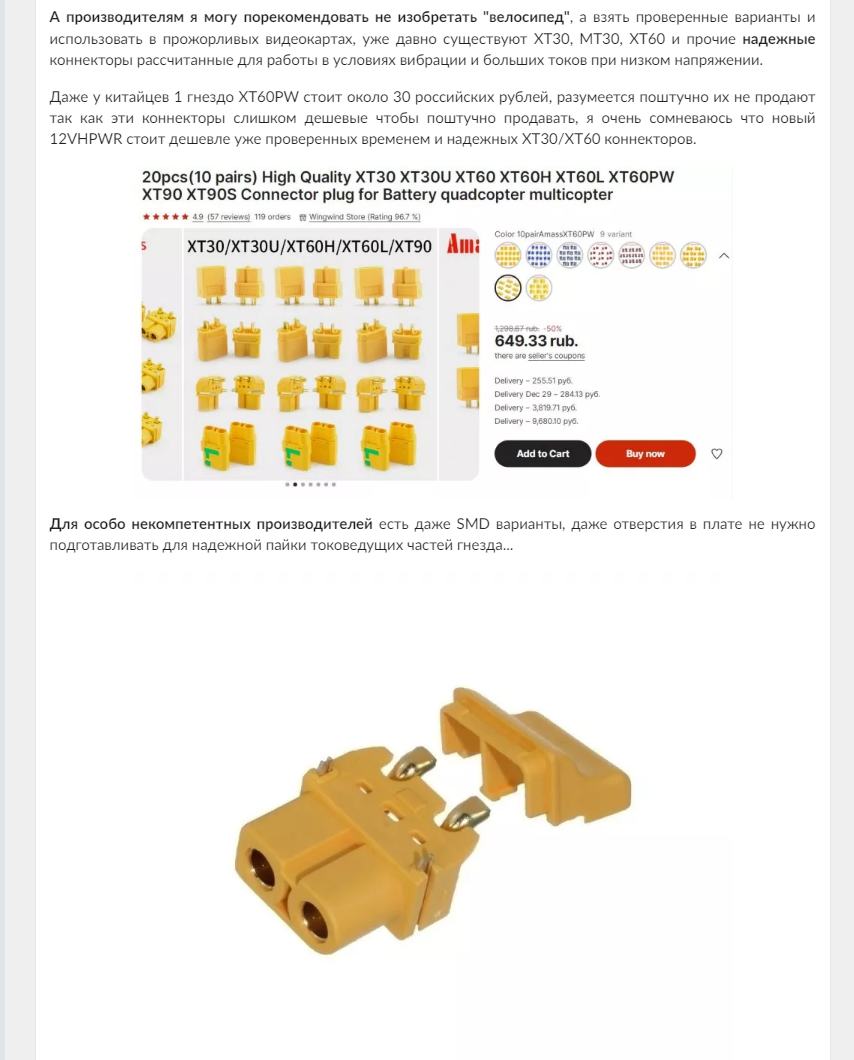 Для производителей есть любые варианты XT60 коннекторов, даже для SMD монтажа если совсем уж отсталое производство, но учитывая какие сложные конструкции производители реализуют, для них нет абсолютно никаких проблем, чтобы внедрить подобные коннекторы в прожорливые видеокарты.