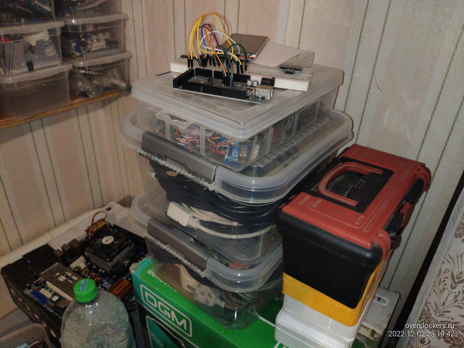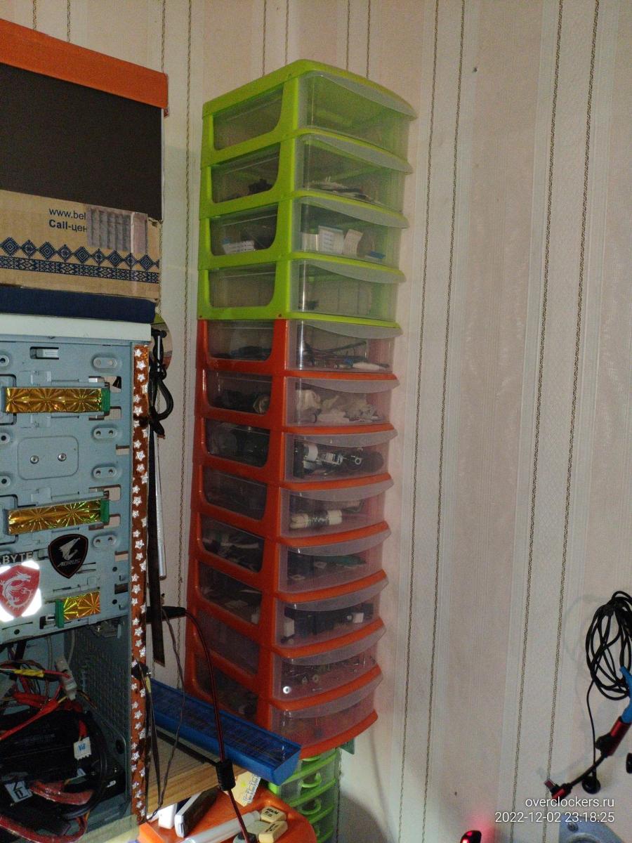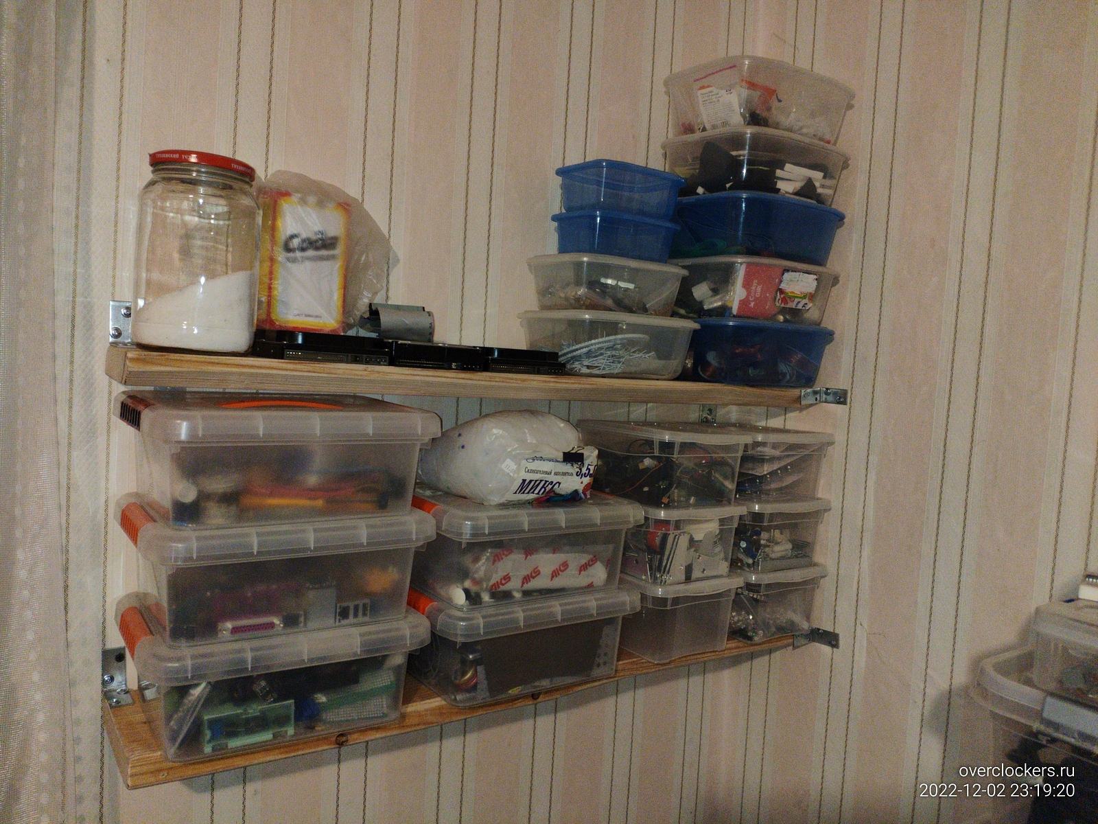 Я не прикручиваю боксы к стенам только по одной причине, их время от времени отодвигаю, чтобы провести уборку стола и полки, если их прикрутить то убирать пыль не выйдет, нужна отдельная полка специально бод контейнеры такого вида, и тогда можно будет прикрутить все к стене.