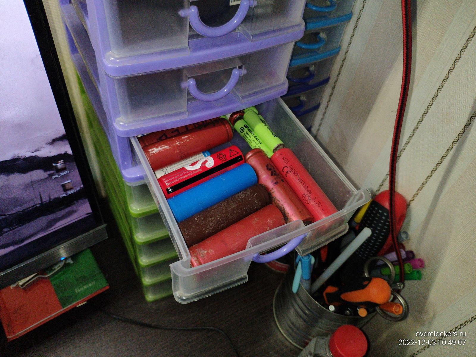 НЕ ПОВТОРЯТЬ! Хранить аккумуляторы таким образом крайне не советую, в моём случае аккумуляторы разряжены и некоторые нужно утилизировать, но это крайне опасно если хранить ЗАРЯЖЕННЫЕ аккумуляторы! Заряженные аккумуляторы могут хранить достаточно энергии, чтобы спровоцировать пожар от любого случайного замыкания, в том числе внутри аккумулятора!