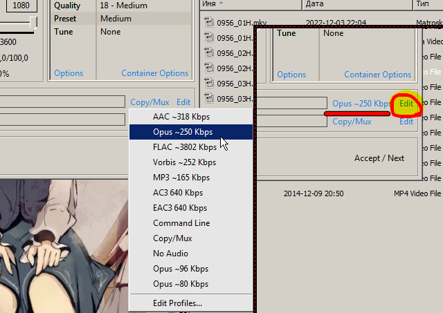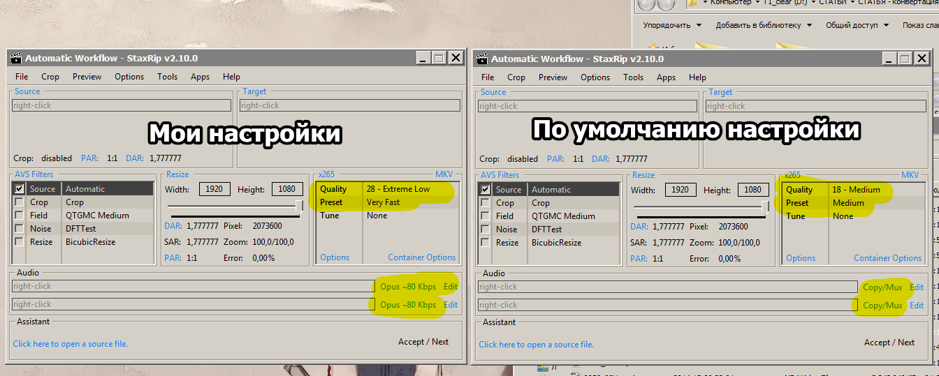 Я же выставляю пресет Very Fast, качество 28 (Extreme Low), аудио Opus ~80 KB/s, причем на обе дорожки аудио, ибо в файле аудио может быть на второй дорожке и тогда оно просто будет скопировано если оставить Copy/Mux по умолчанию.