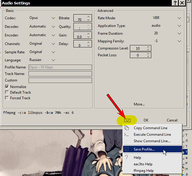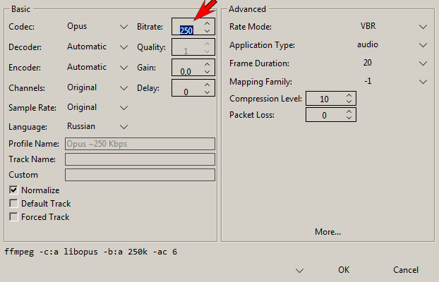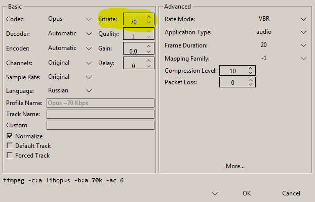 Так как в заготовках нет Opus ~80 KB/s, я создал вручную профиль на основе стандартного Opus ~250 KB/s, ничего сложного в этом нет, если знать куда нажимать: