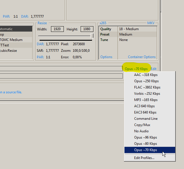 Прежде всего покажу настройки, по умолчанию x265, качество 18 (Medium), пресет средний (Medium), звук просто копирует без обработки...