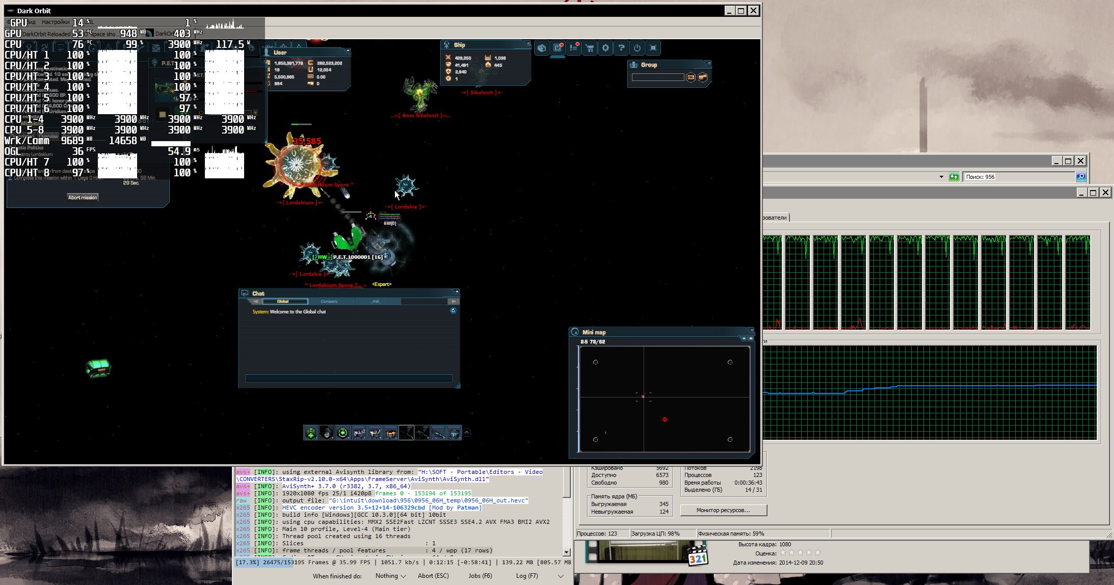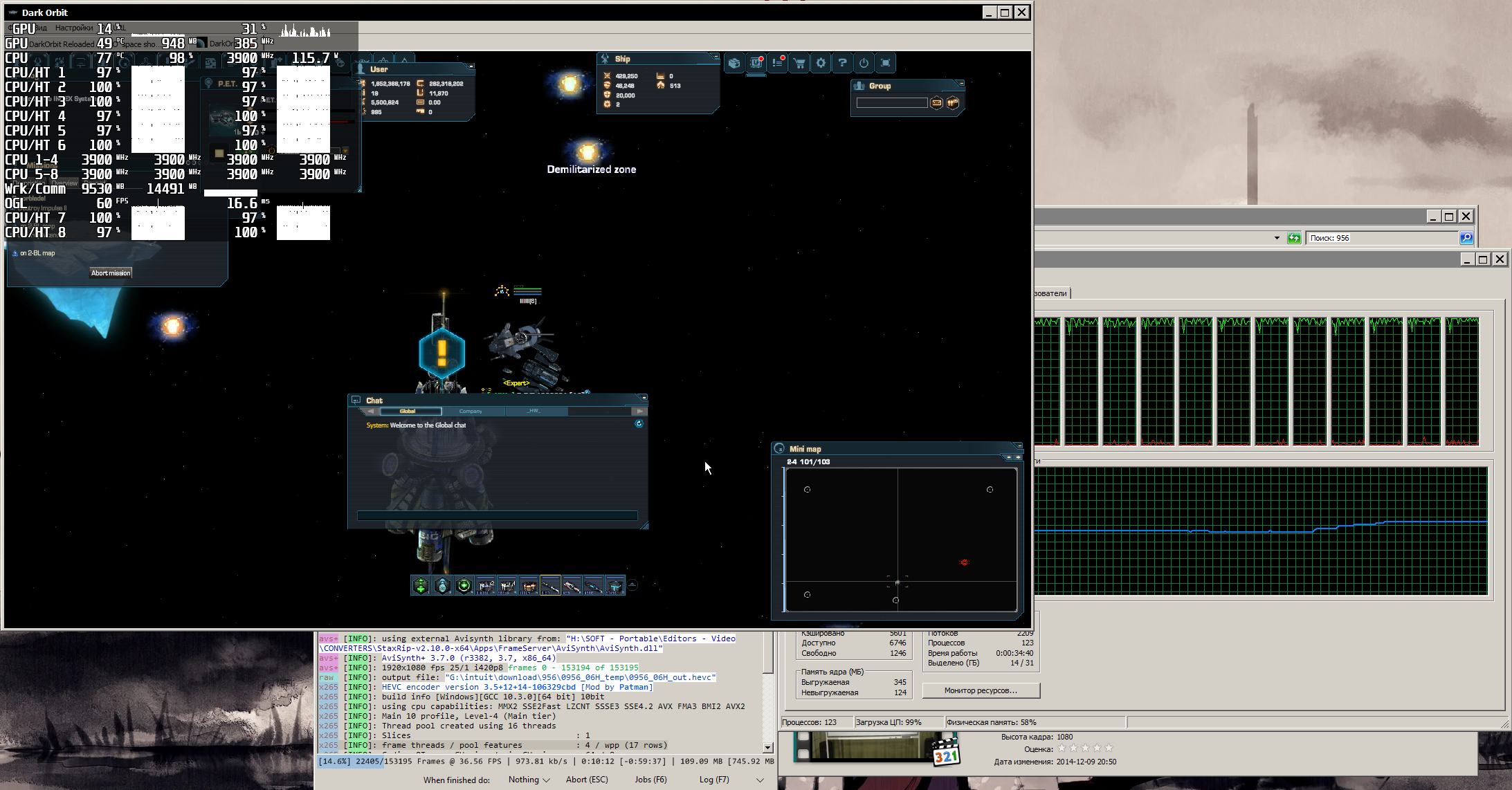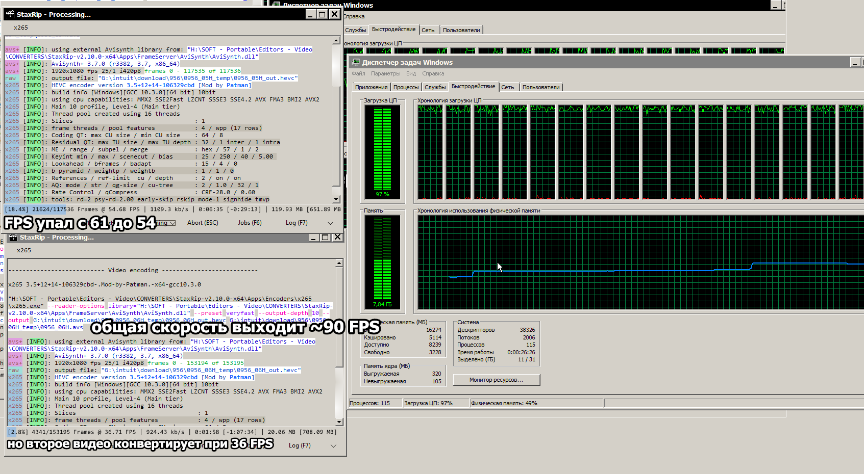 После запуска второго конвертера производительность первого немного поубавилась, но общая производительность при этом значительно выше стала (~90 FPS вместо ~61), теперь планировщик Windows 7 распределил задачи по всем потокам и ресурс процессора задействован почти полностью, именно в таком состоянии мой ПК проводит основную часть времени пока не обработаю все видео.