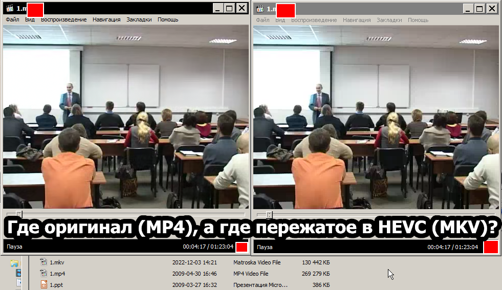 Да, пережатое в HEVC оказалось слева, а оригинал справа...