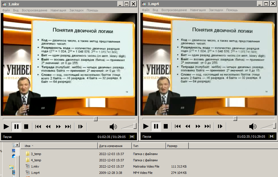 И еще пример хорошего сжатия, конечное видео в 14 раз меньше занимает места чем оригинал, но качество при этом сильно не пострадало, где-то немного подмылило, но это абсолютно не мешает никак, все самое важное отлично видно.