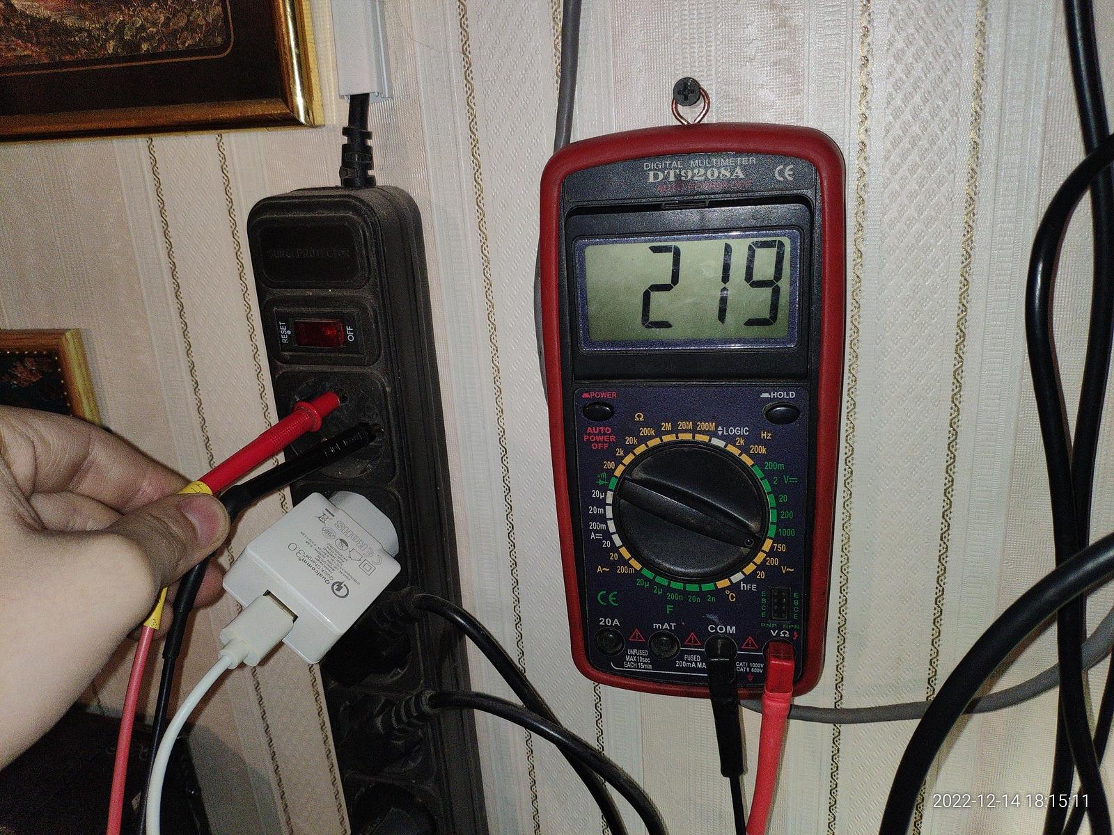 Замер напряжения в электросети, 219в на момент проведения тестов, подключаю мультиметр в паре с "магической" розеткой для замера потребляемого тока, в общем ничего особенного, типичная ситуация.