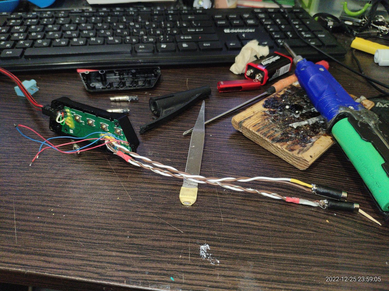 Отрезаю все лишнее, перепроверяю чтобы микрофон не имел общих точек с динамиками, подготавливаю провода для пайки, все отлично.