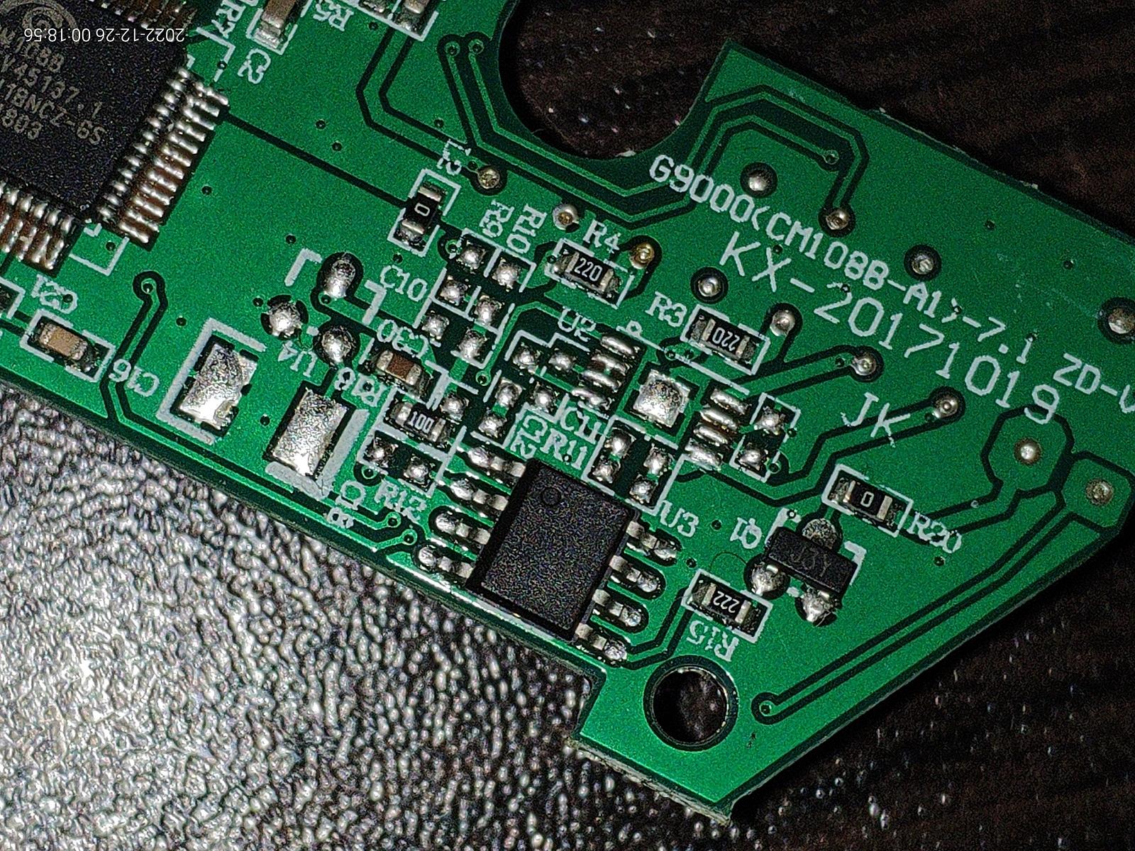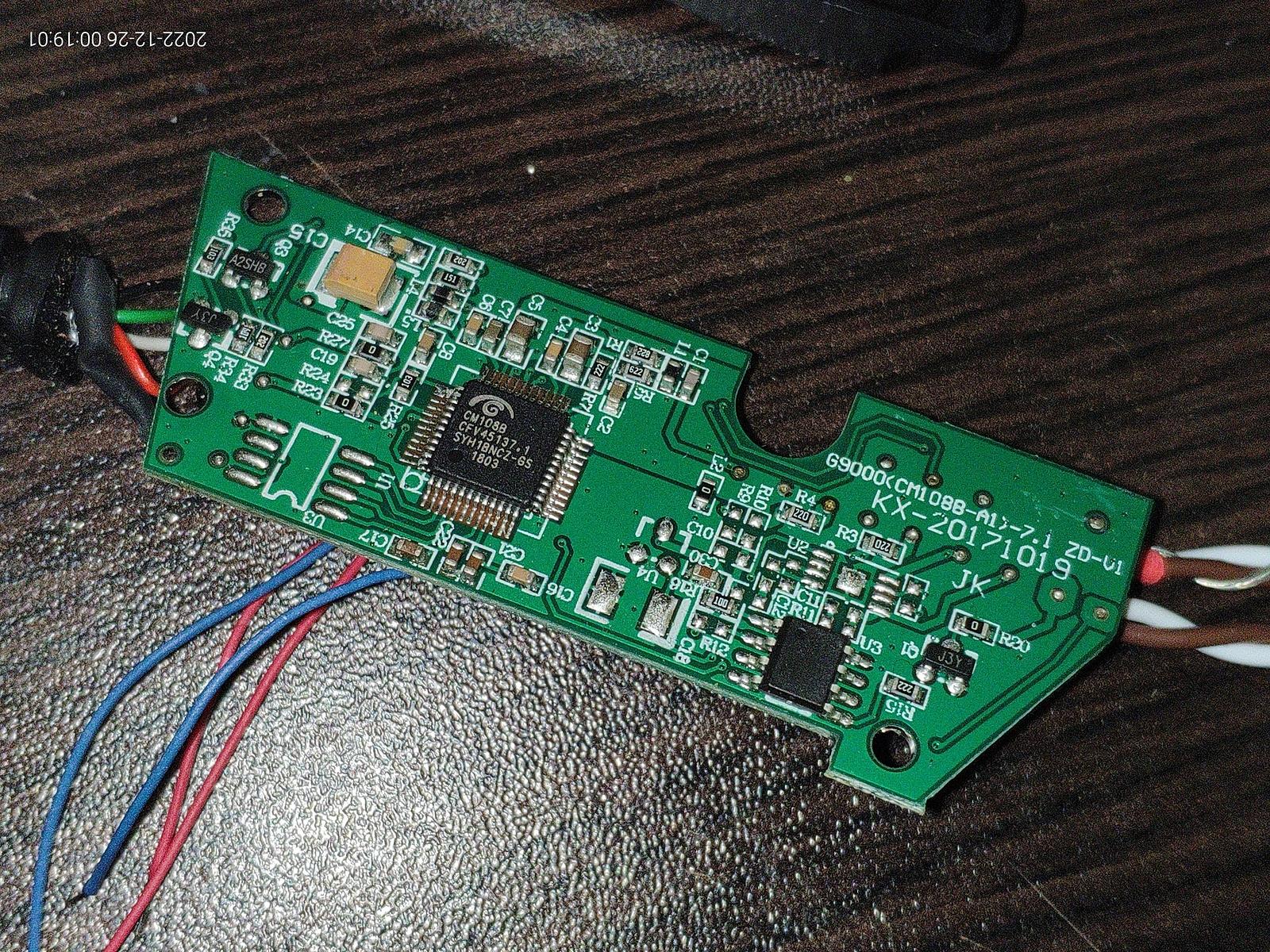А вот и аудио кодек, CM108B от Cmedia, маркировка дополнительной микросхемы затерта, что довольно забавно.