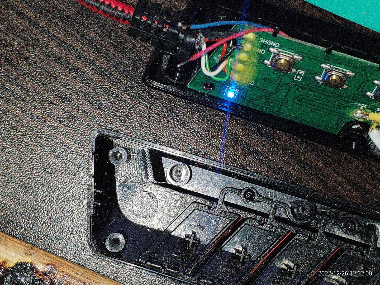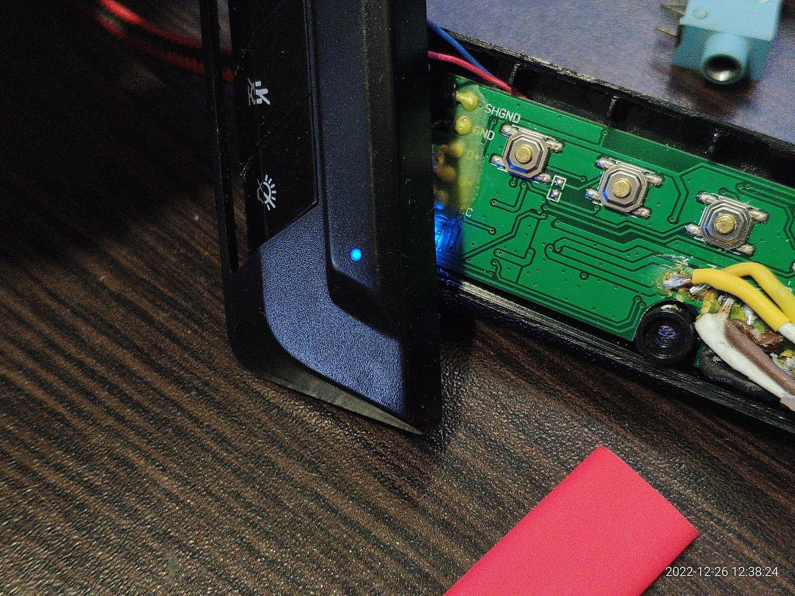 Возле синего светодиода есть энкодер включения/перезагрузки, слева включение, справа перезагрузка, автоматически возвращается в нейтральное положение.