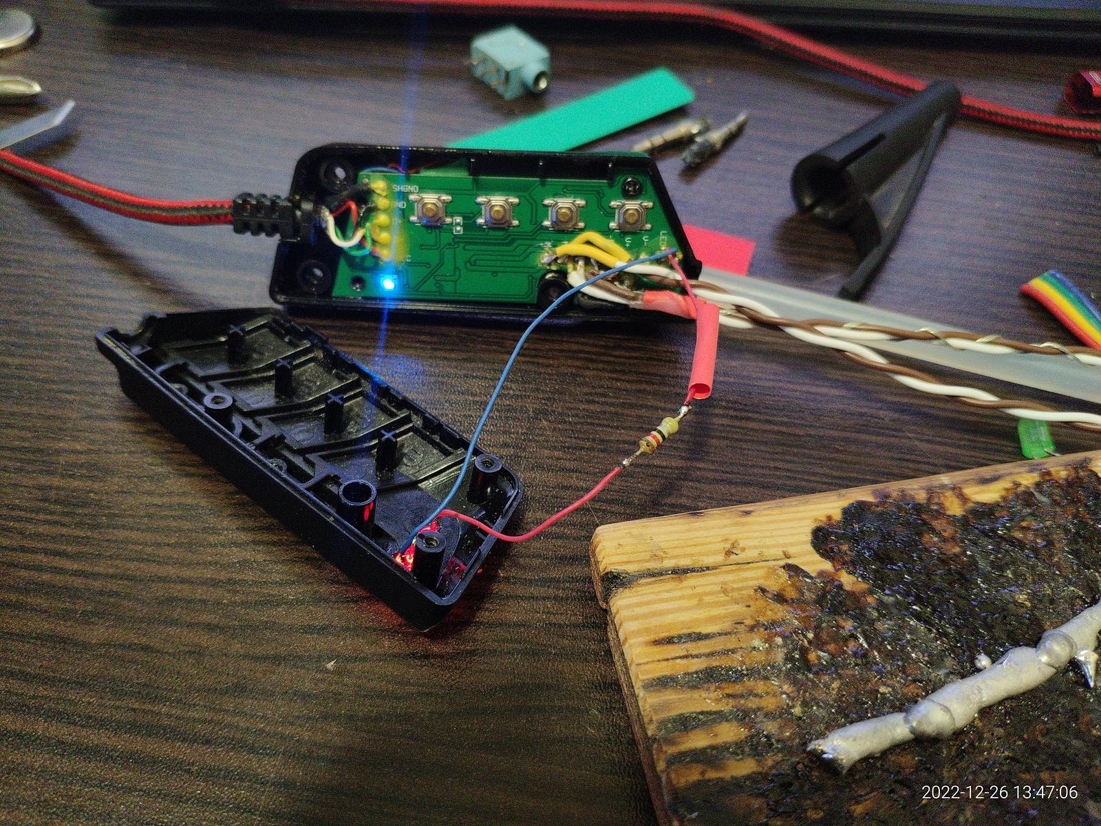 Подсветку в наушниках я отключил, но возможности в звуковой карте никуда не исчезли, хотя по факту подсветка микрофона это просто 5в питание, а подсветка наушников это контролируемые 5в питания, потому я взял 2 красных светодиода и резистор чтобы ничего не сгорело случайно.