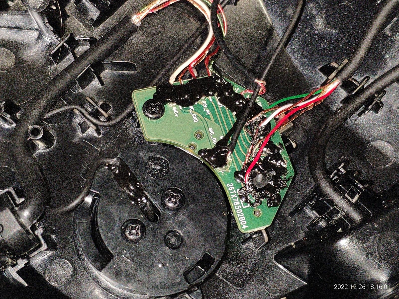 Разбираю наушники HyperX, и что же я вижу? А ничего примечательного, все как в типичных дешевых наушниках, просто провода разветвляются между микрофоном и динамиками, никакой магии и особых схем для шумоподавления микрофона которое заявлено в характеристиках...