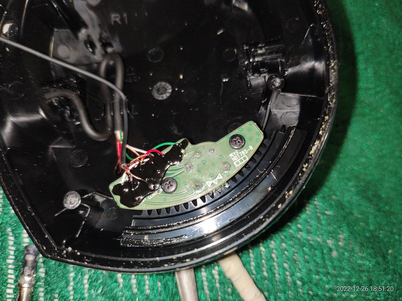 А вот так выглядит регулятор громкости, обычный переменный резистор и механический элемент управления, все так же как в самых дешевых наушниках.