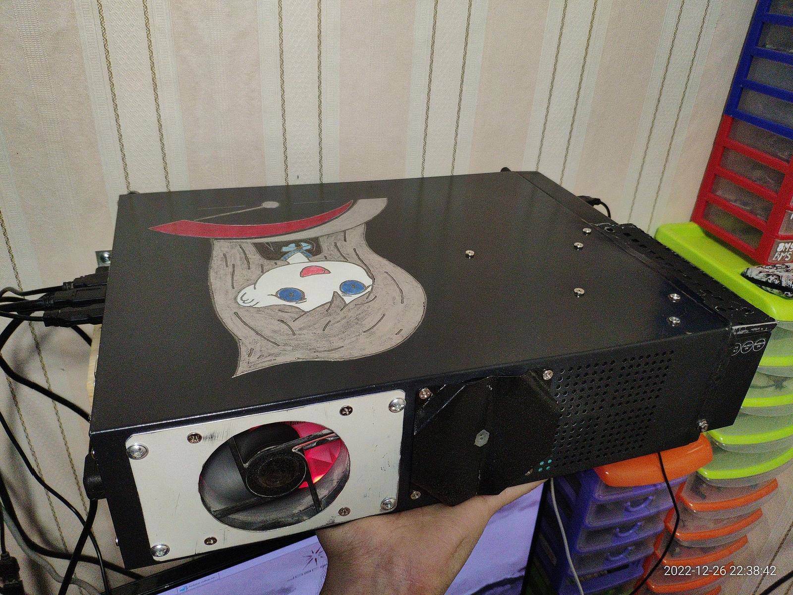 - Система охлаждения ЦП модифицированная серверная 2U башня, 4 трубки, прямой выброс нагретого воздуха за пределы корпуса, 2 классических вентилятора проталкивают воздух через радиатор, эффективно отводит ~135 Вт тепла с 12нм процессором Ryzen 7 2700X при нагрузке ядер (ALU), ~120 Вт при нагрузке FPU блоков, ~90 Вт от 7нм процессора Ryzen 5 5500 при нагрузке на FPU.