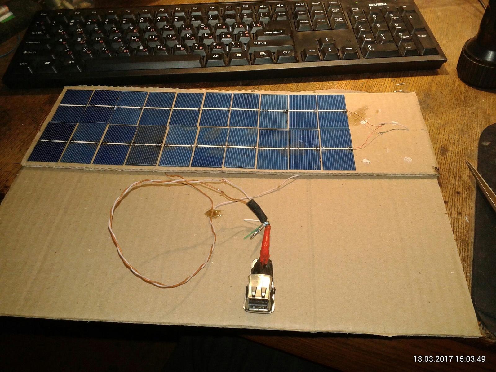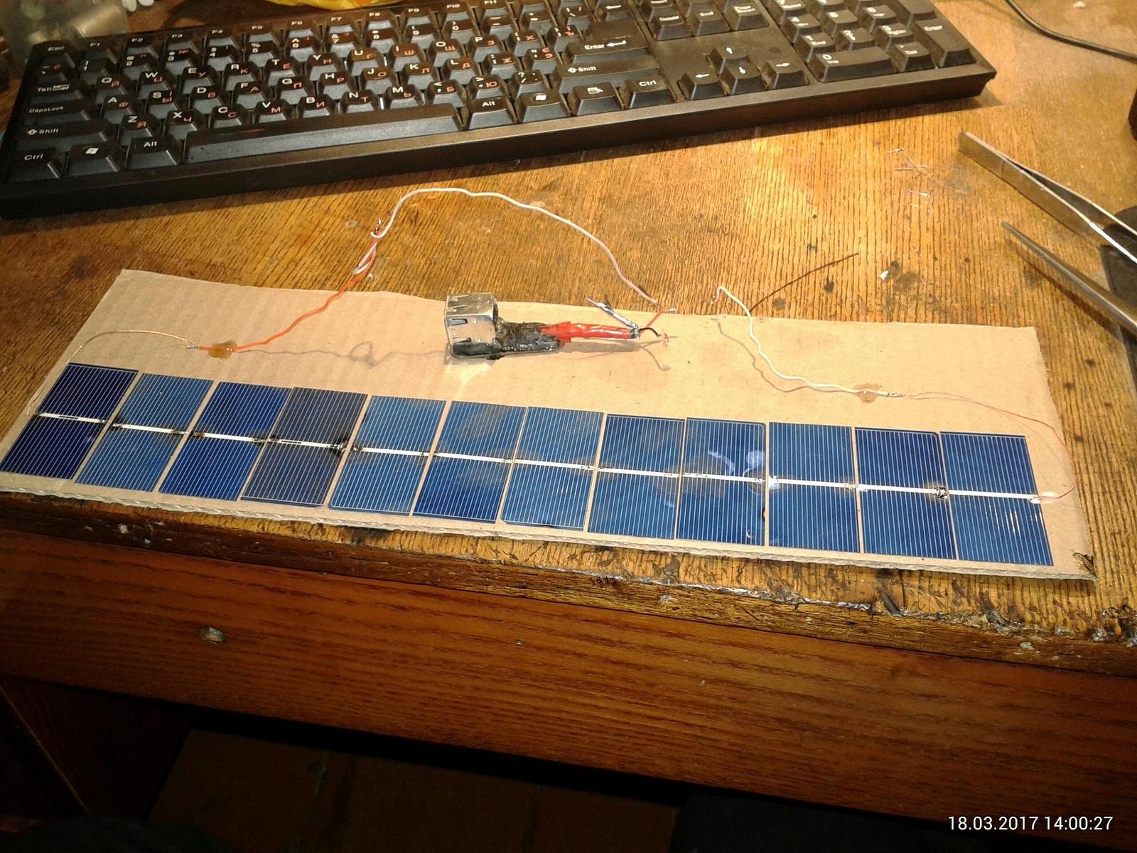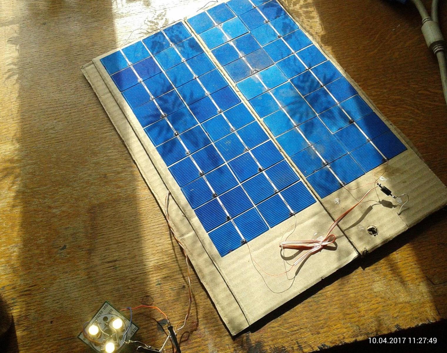 Далее перейду к солнечной панели, эту панель собирал из дешевых китайских пластин, в качестве основы выбрал картон, и в целом у меня получилось нечто, оно даже работало.