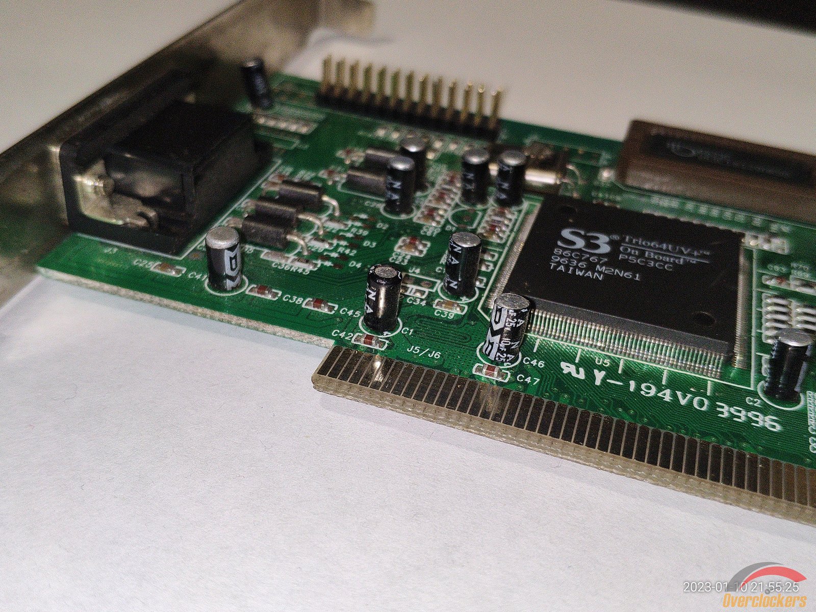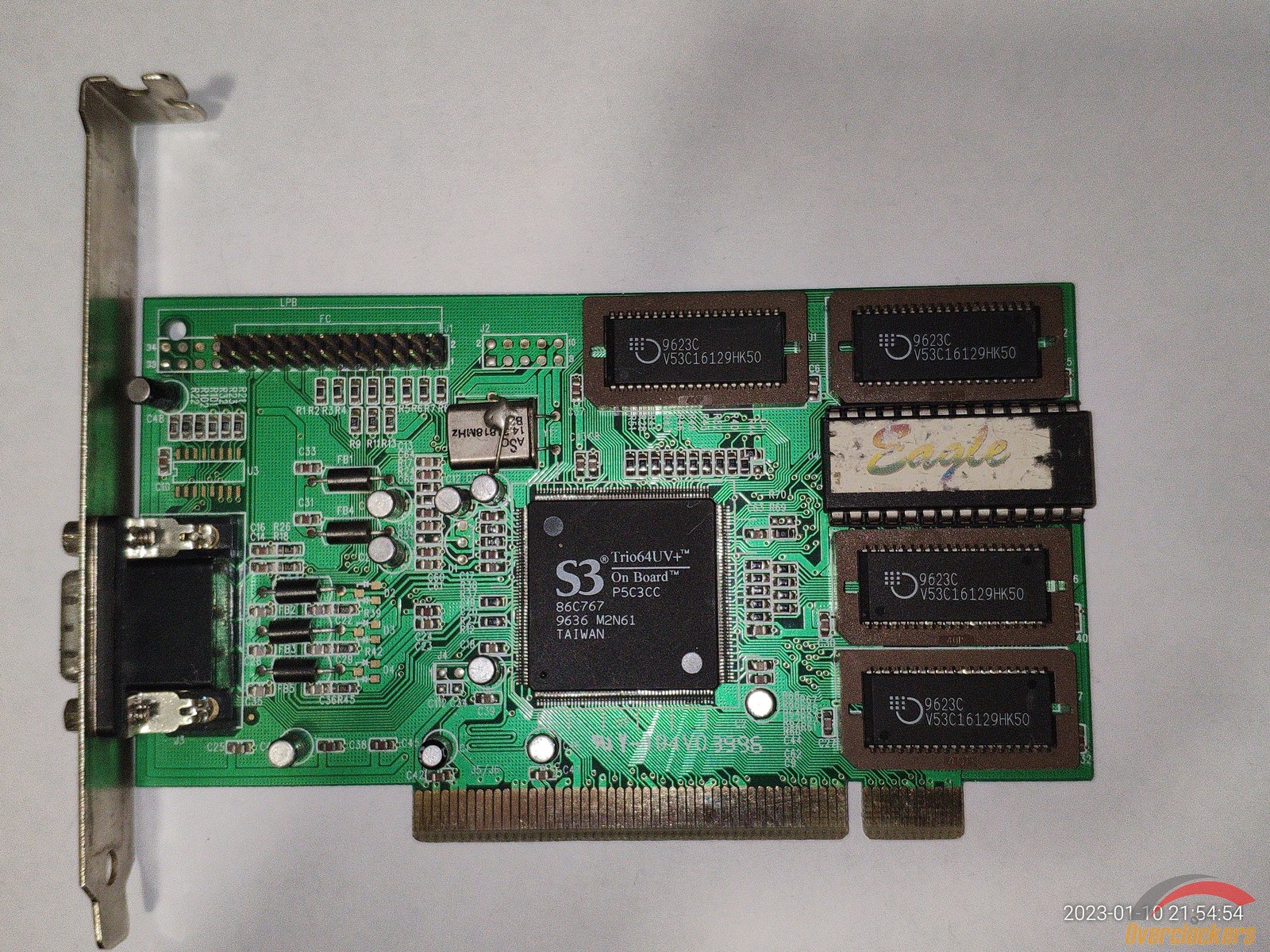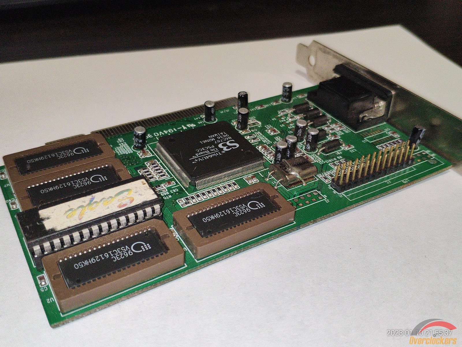 Начну с видеокарты S3 Trio64UV+, подключение PCI, 4 микросхемы памяти V53C16129HK50, чип 86C767, из подключений для мониторов есть только VGA, выпускалась видеокарта примерно в 1996 году.