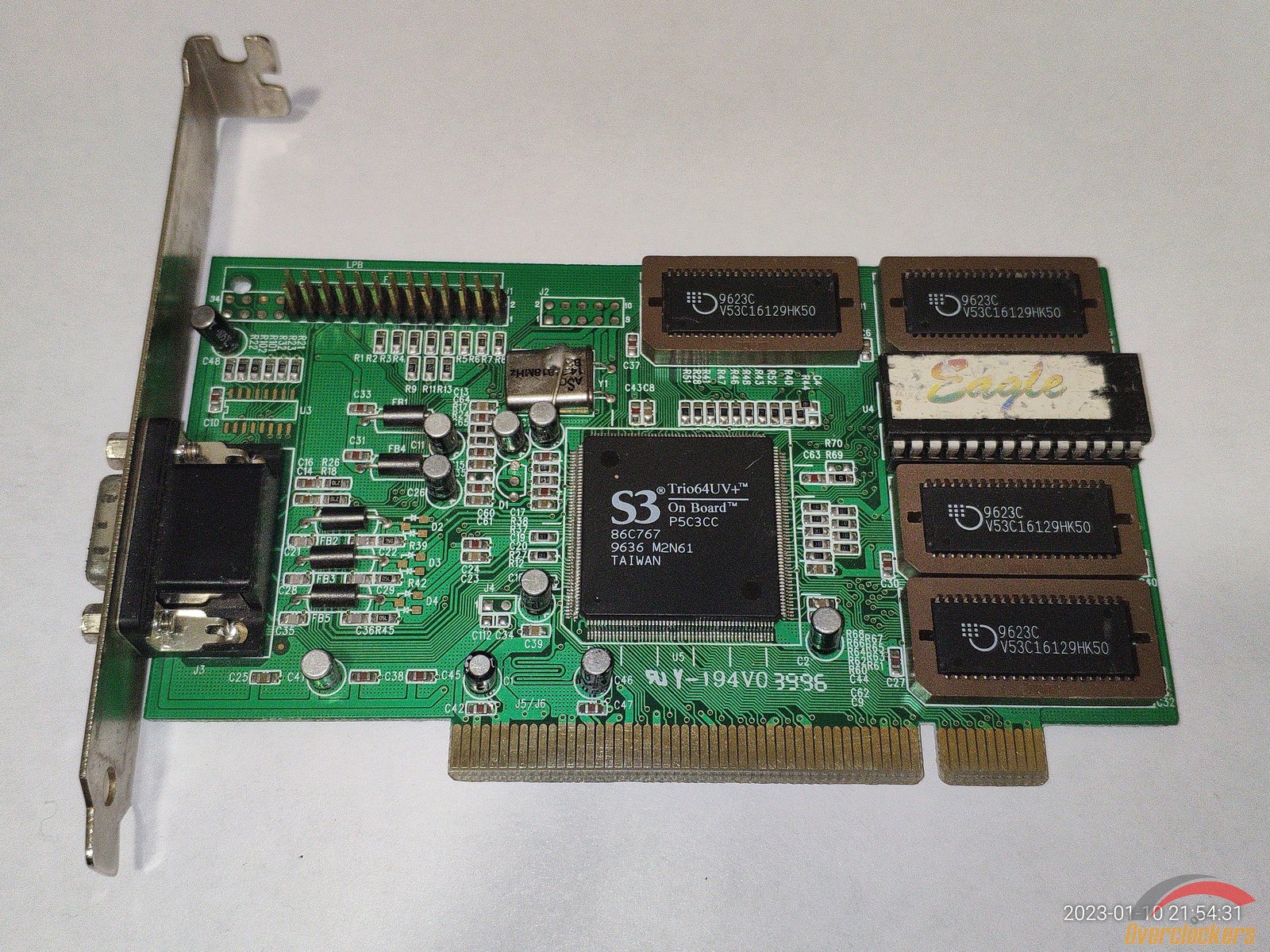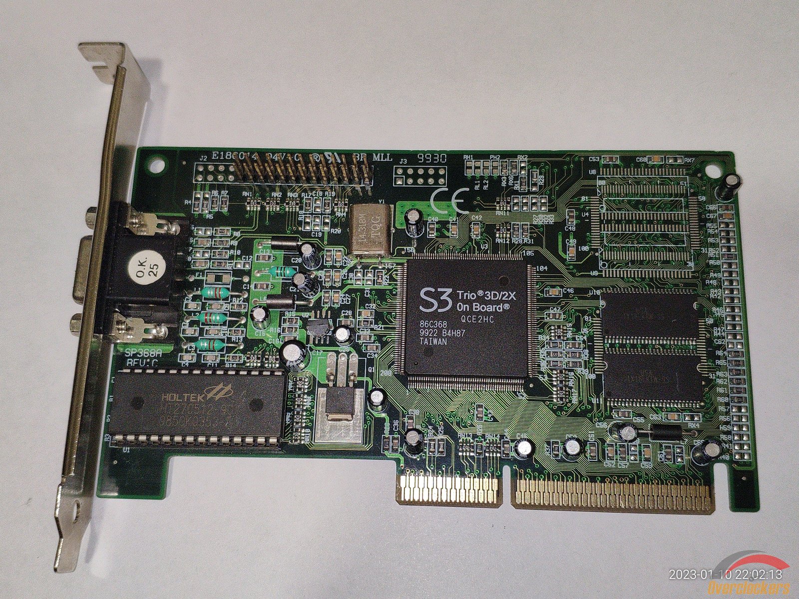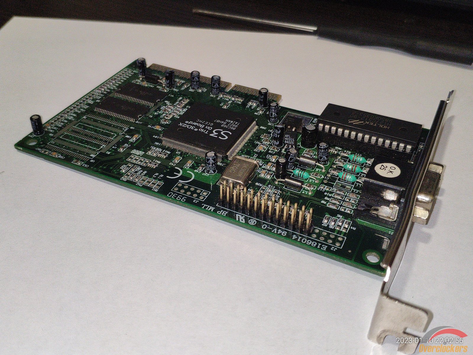 Начну с видеокарты S3 Trio64UV+, подключение PCI, 4 микросхемы памяти V53C16129HK50, чип 86C767, из подключений для мониторов есть только VGA, выпускалась видеокарта примерно в 1996 году.