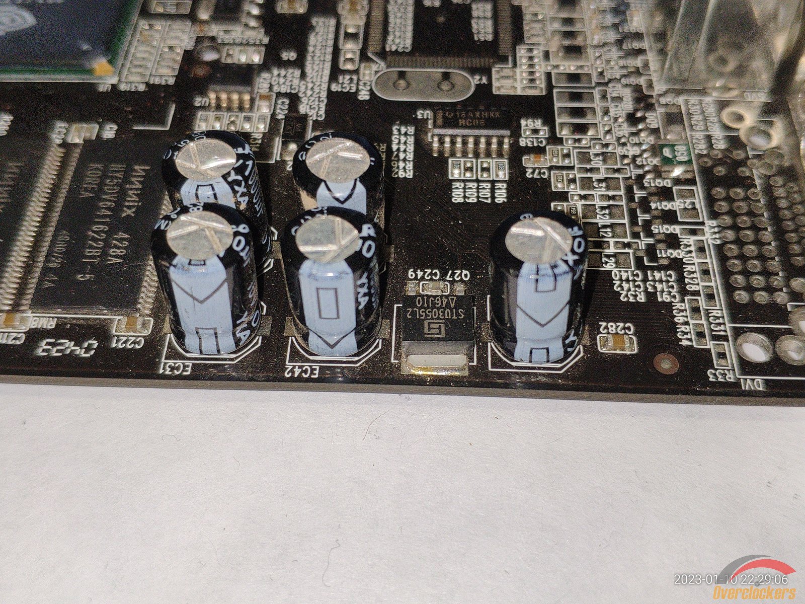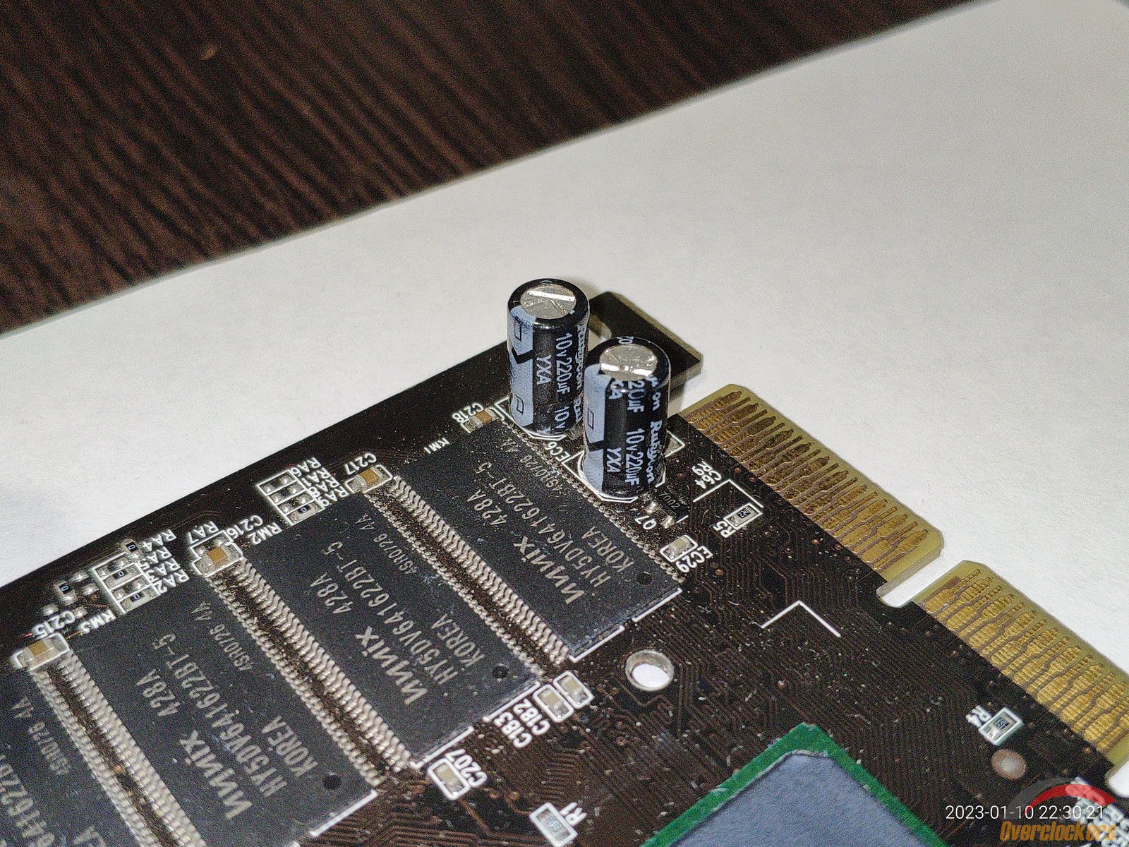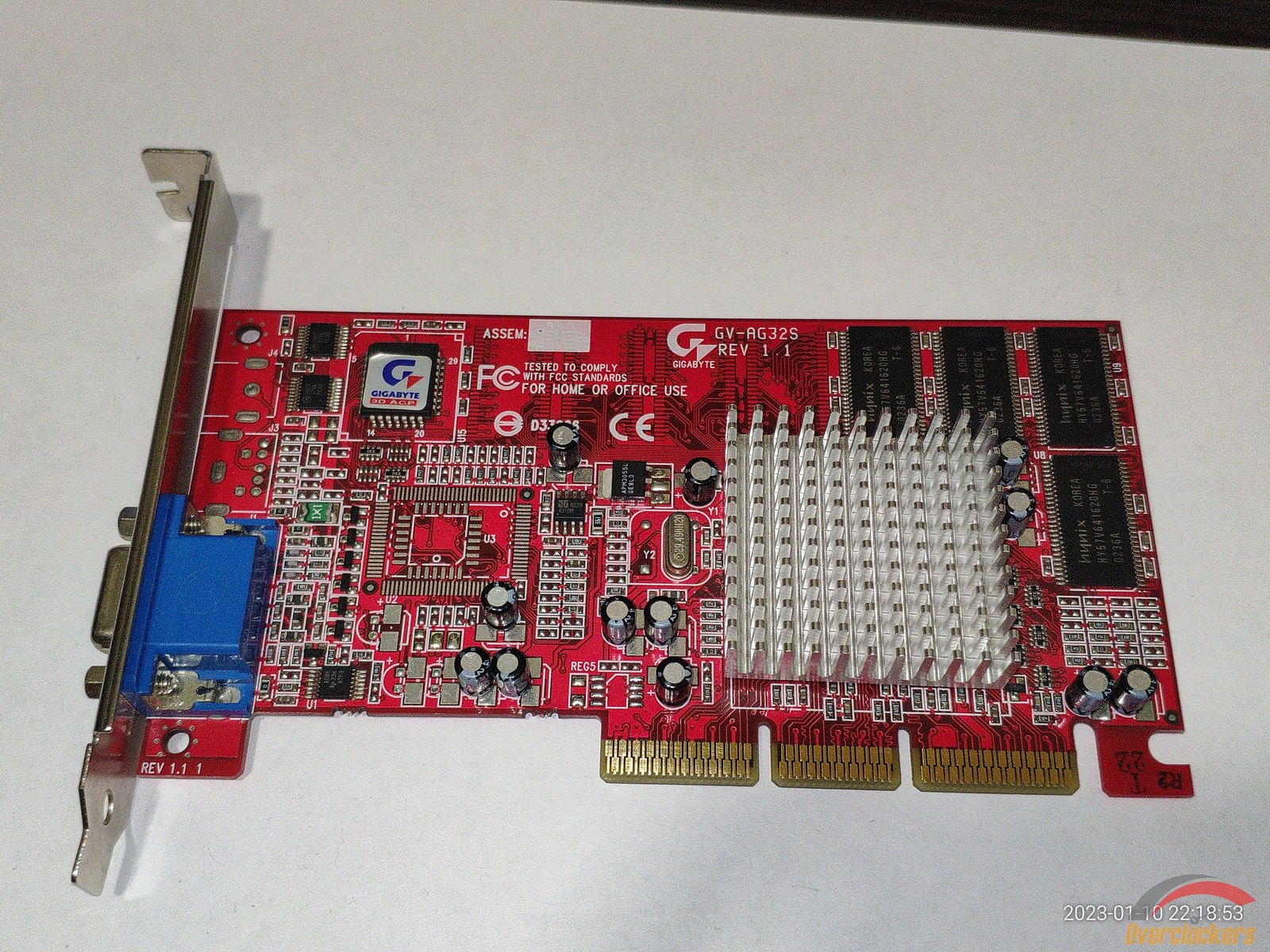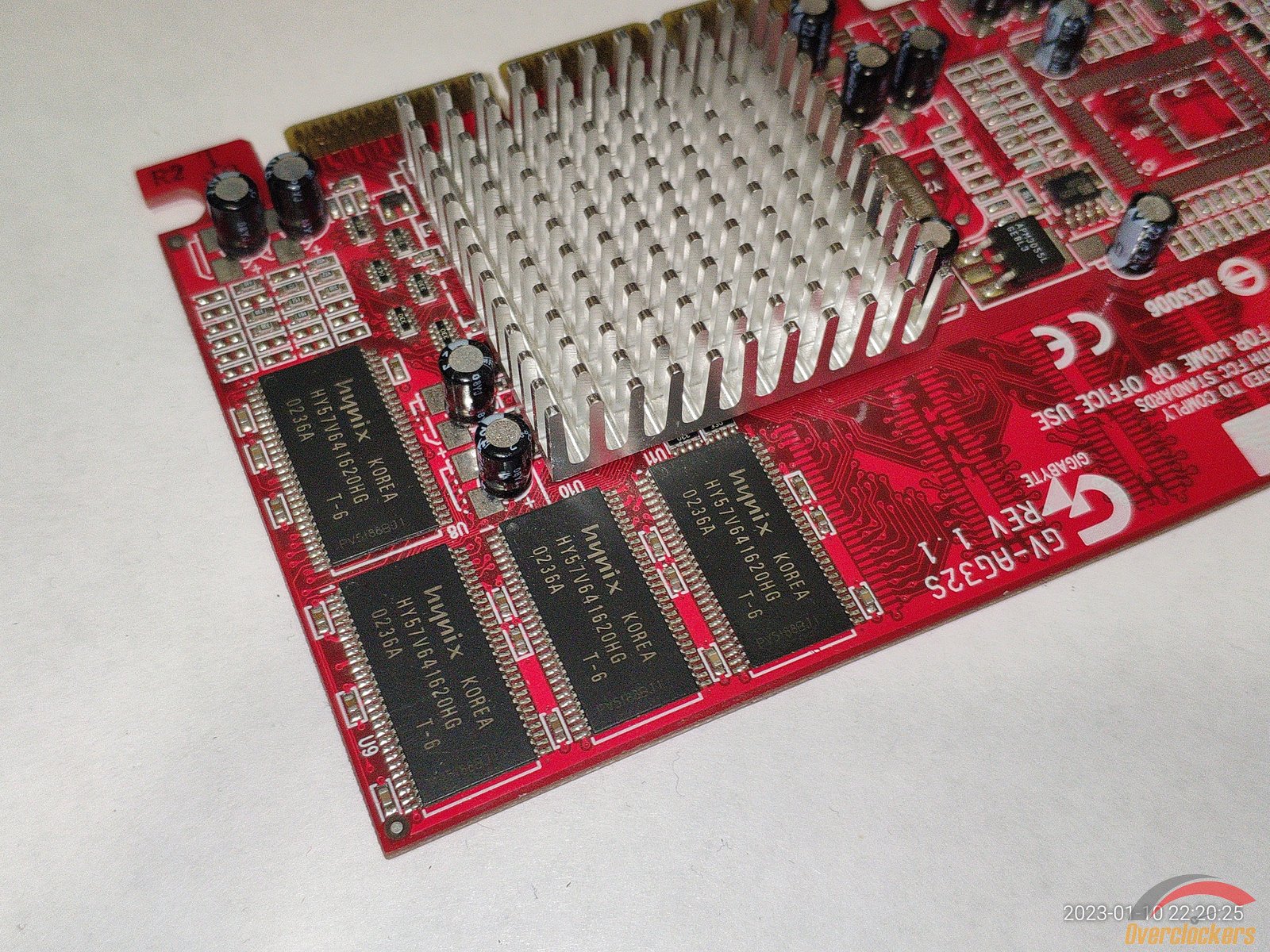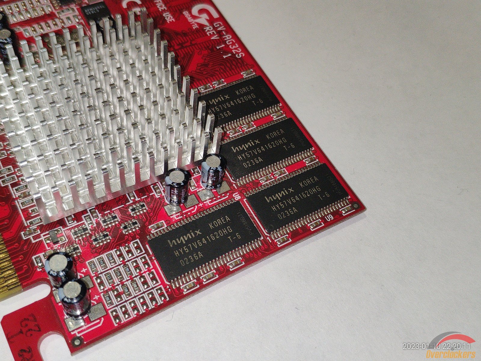 На плате есть 4 чипа Hynix HY57V641620HG T-6, эти чипы рассчитаны на частоту 166 МГц, хотя по спецификациям у данной Rage 128 Pro память работает на частоте 120 МГц, так что фактически есть надежный запас для разгона памяти, в общем довольно приятный бонус.