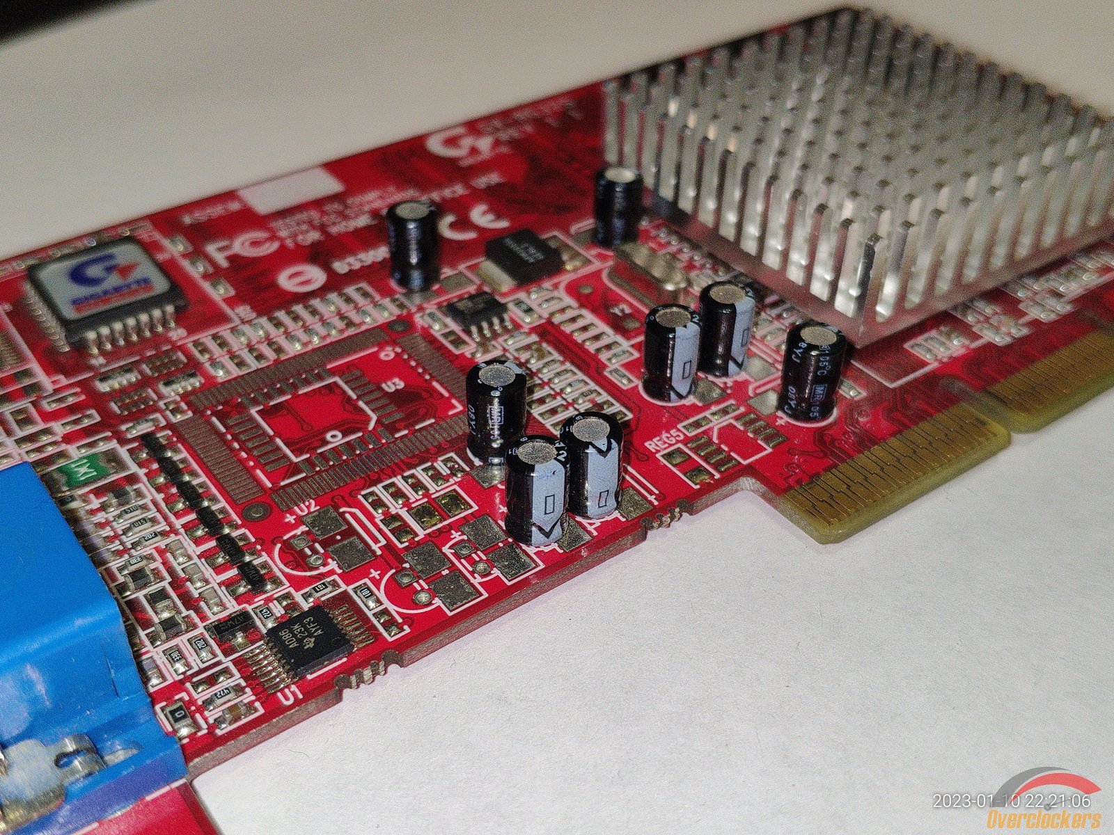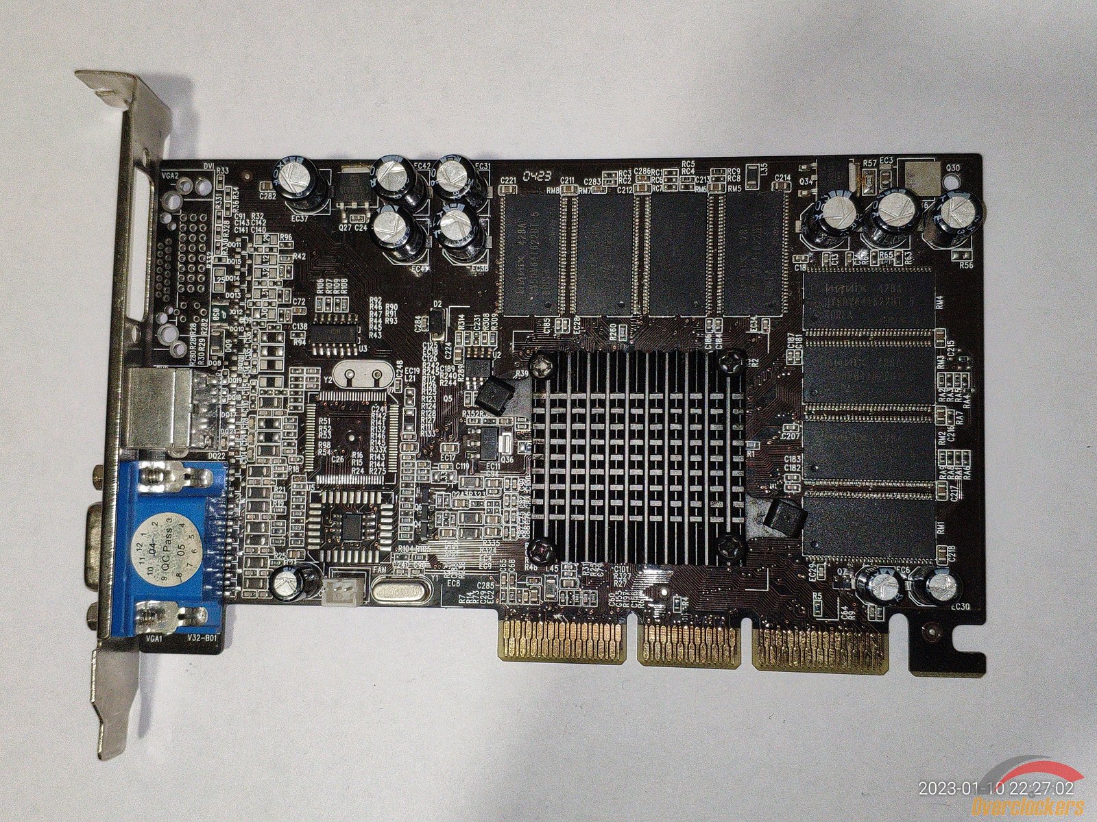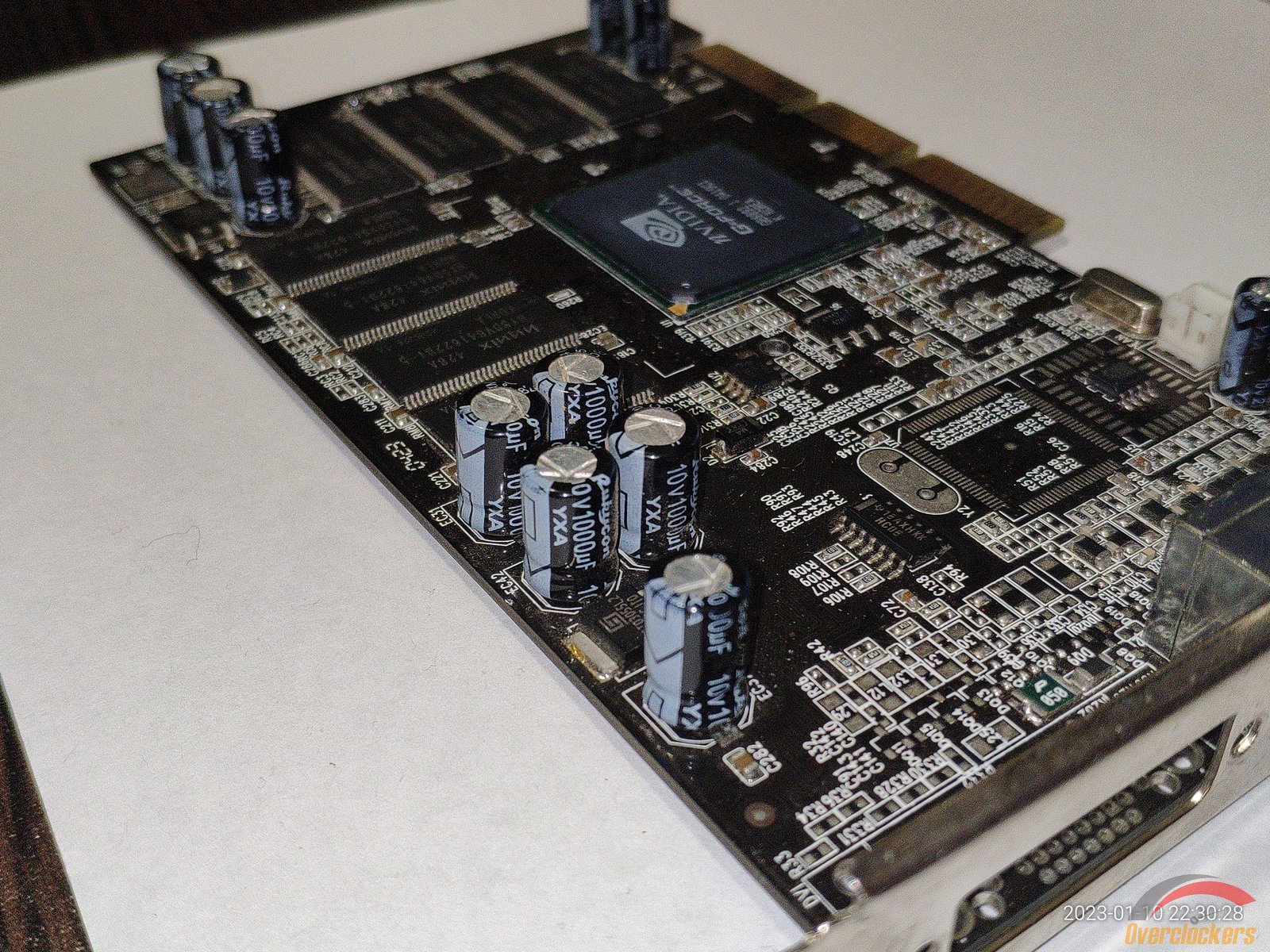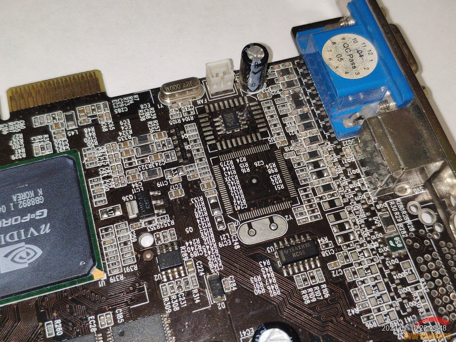 Из особенного следует отметить чип, здесь видны явные следы стирания старой маркировки, на этом месте была новая маркировка краской, но она облезла со временем, и это стирание явно сделано самой nVidia, ибо какой смысл производителю видеокарты стирать старую маркировку и наносить новую на один и тот же чип? Производитель видеокарты сам прирастит дополнительные 4 линии AGP к чипу на уже готовой плате? Очень сомневаюсь, плата явно была сделана для NV18 с AGP 8x, и не было смысла ставить чип NV17 с AGP 4x и потом уже на плате как-то хитрить меняя маркировку...