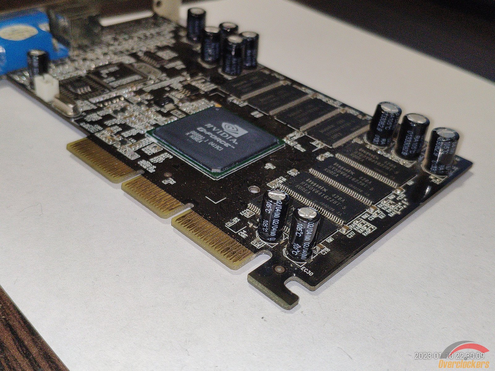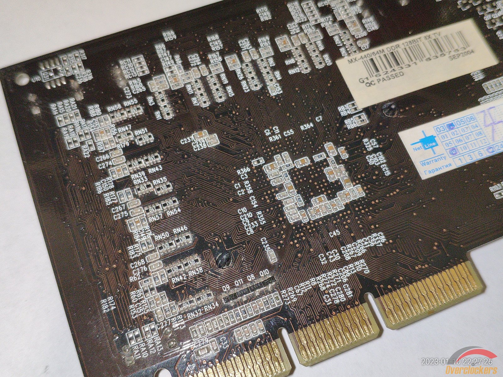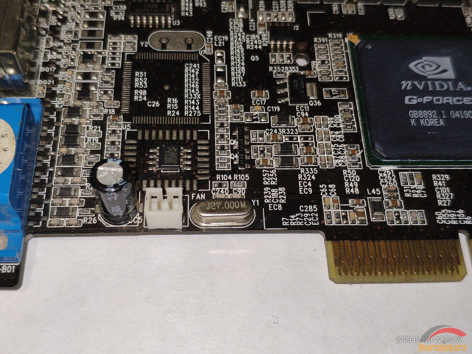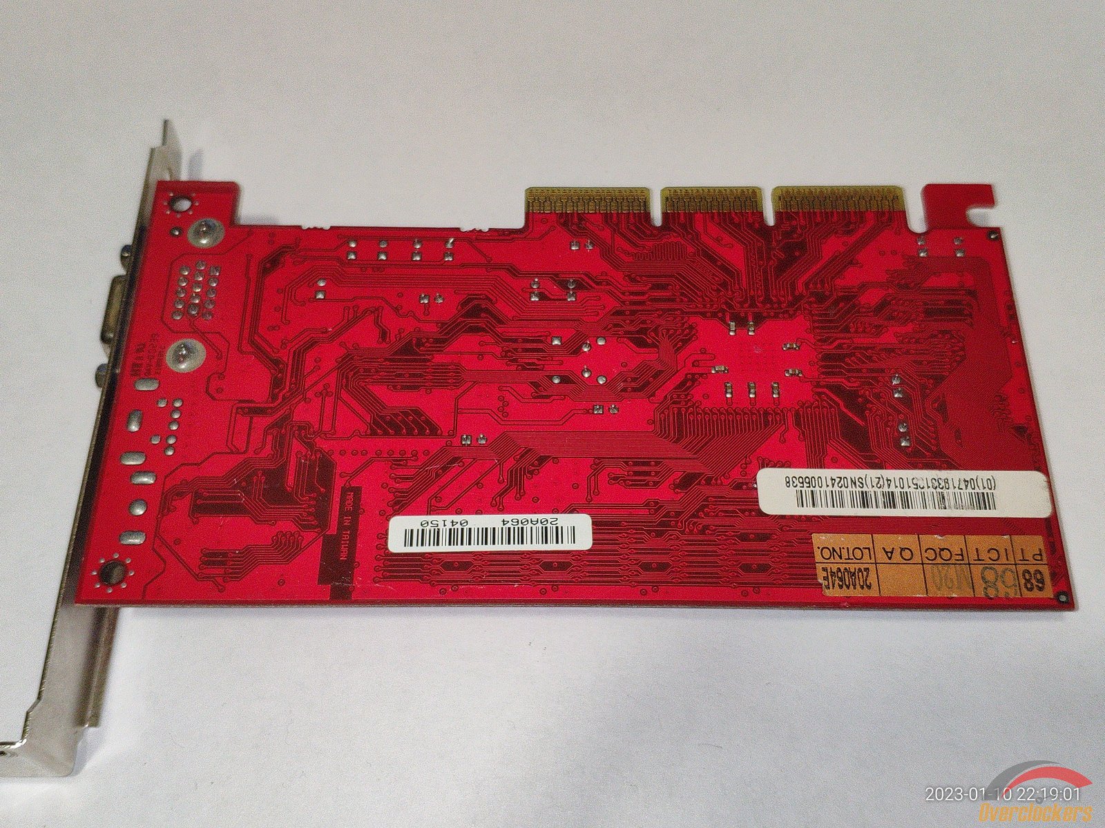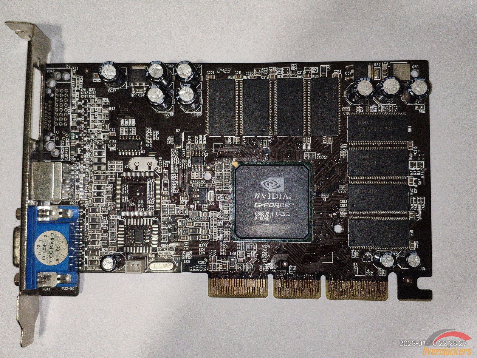 Из особенного следует отметить чип, здесь видны явные следы стирания старой маркировки, на этом месте была новая маркировка краской, но она облезла со временем, и это стирание явно сделано самой nVidia, ибо какой смысл производителю видеокарты стирать старую маркировку и наносить новую на один и тот же чип? Производитель видеокарты сам прирастит дополнительные 4 линии AGP к чипу на уже готовой плате? Очень сомневаюсь, плата явно была сделана для NV18 с AGP 8x, и не было смысла ставить чип NV17 с AGP 4x и потом уже на плате как-то хитрить меняя маркировку...