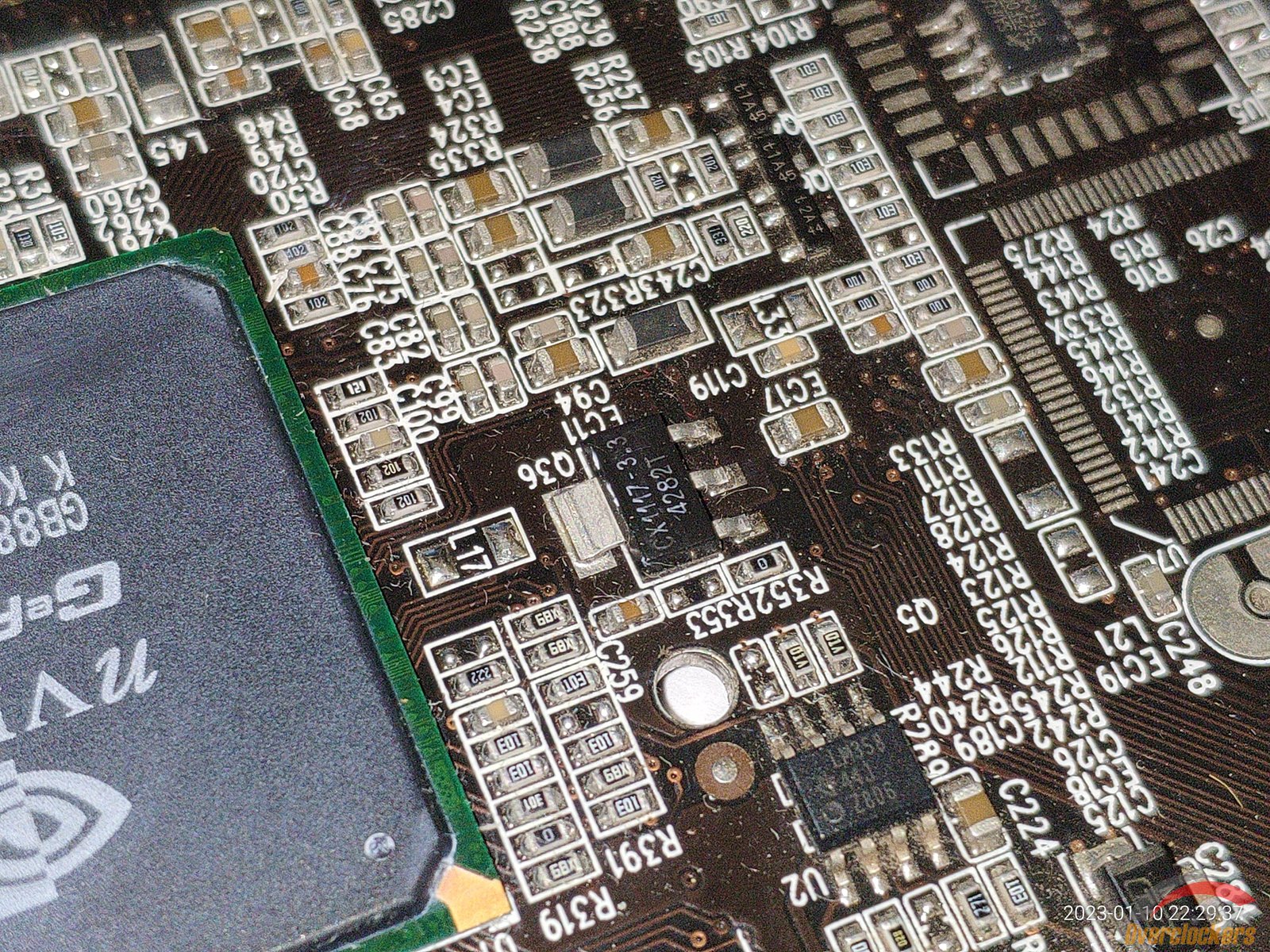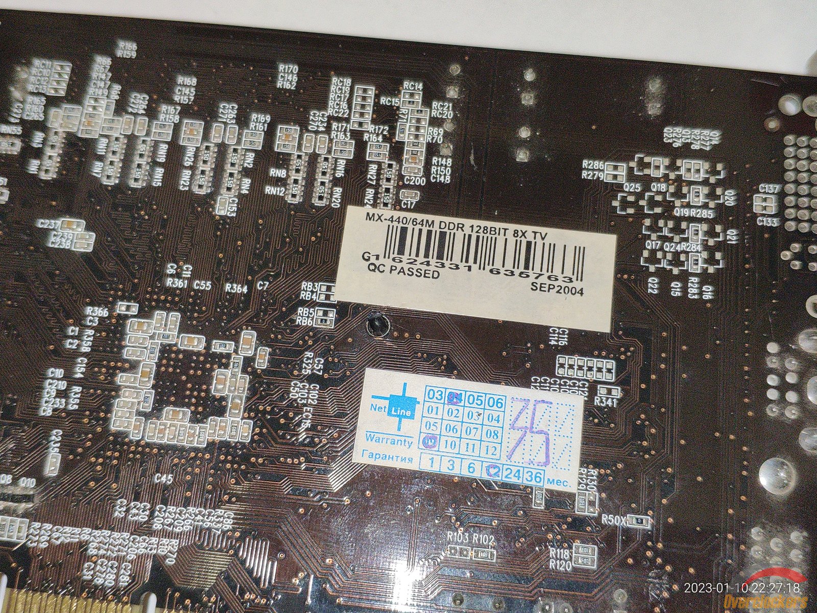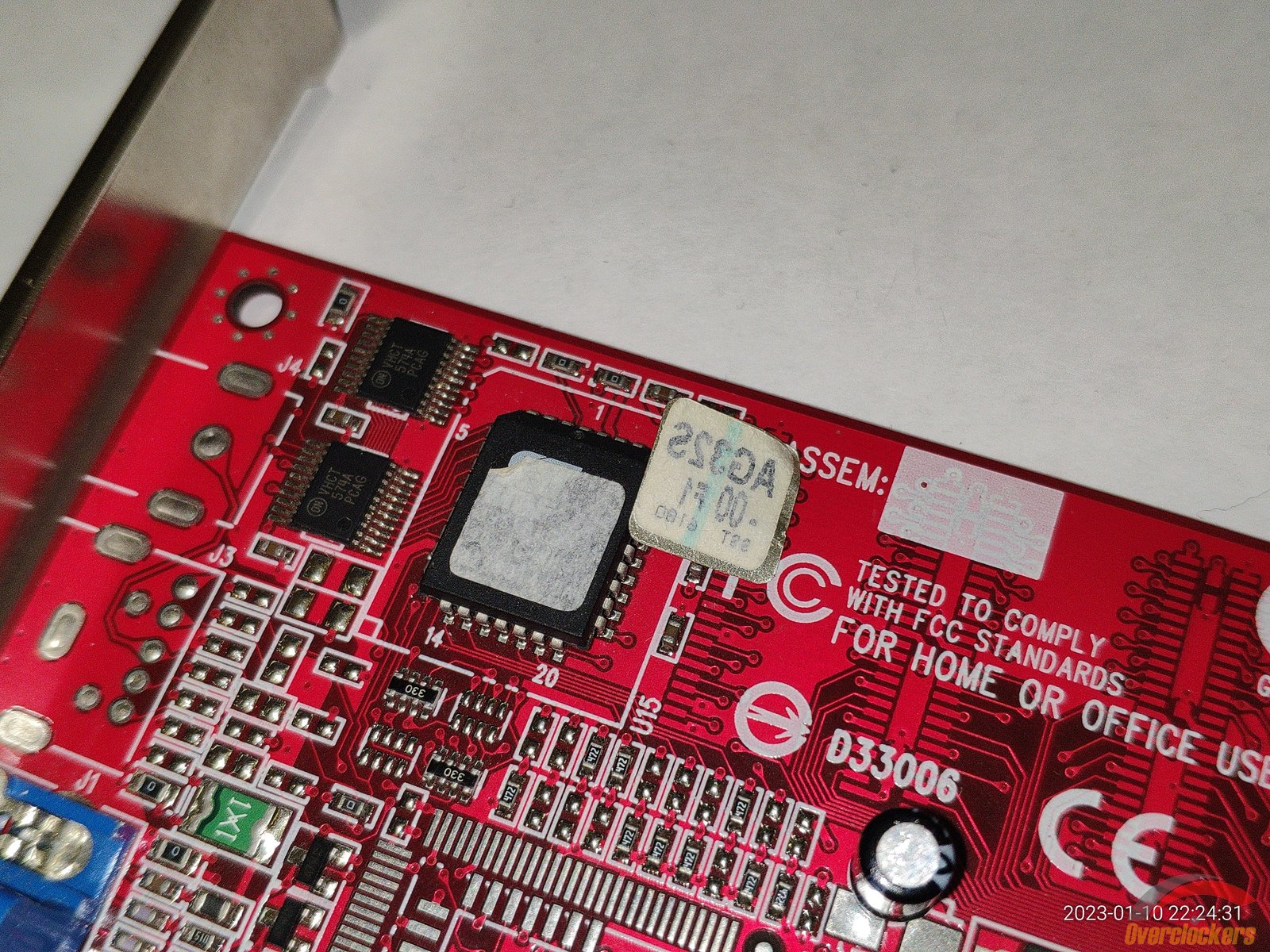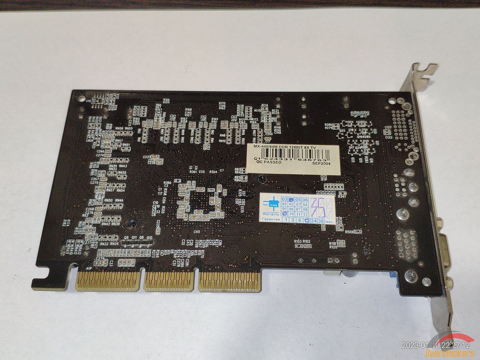 Из особенного следует отметить чип, здесь видны явные следы стирания старой маркировки, на этом месте была новая маркировка краской, но она облезла со временем, и это стирание явно сделано самой nVidia, ибо какой смысл производителю видеокарты стирать старую маркировку и наносить новую на один и тот же чип? Производитель видеокарты сам прирастит дополнительные 4 линии AGP к чипу на уже готовой плате? Очень сомневаюсь, плата явно была сделана для NV18 с AGP 8x, и не было смысла ставить чип NV17 с AGP 4x и потом уже на плате как-то хитрить меняя маркировку...
