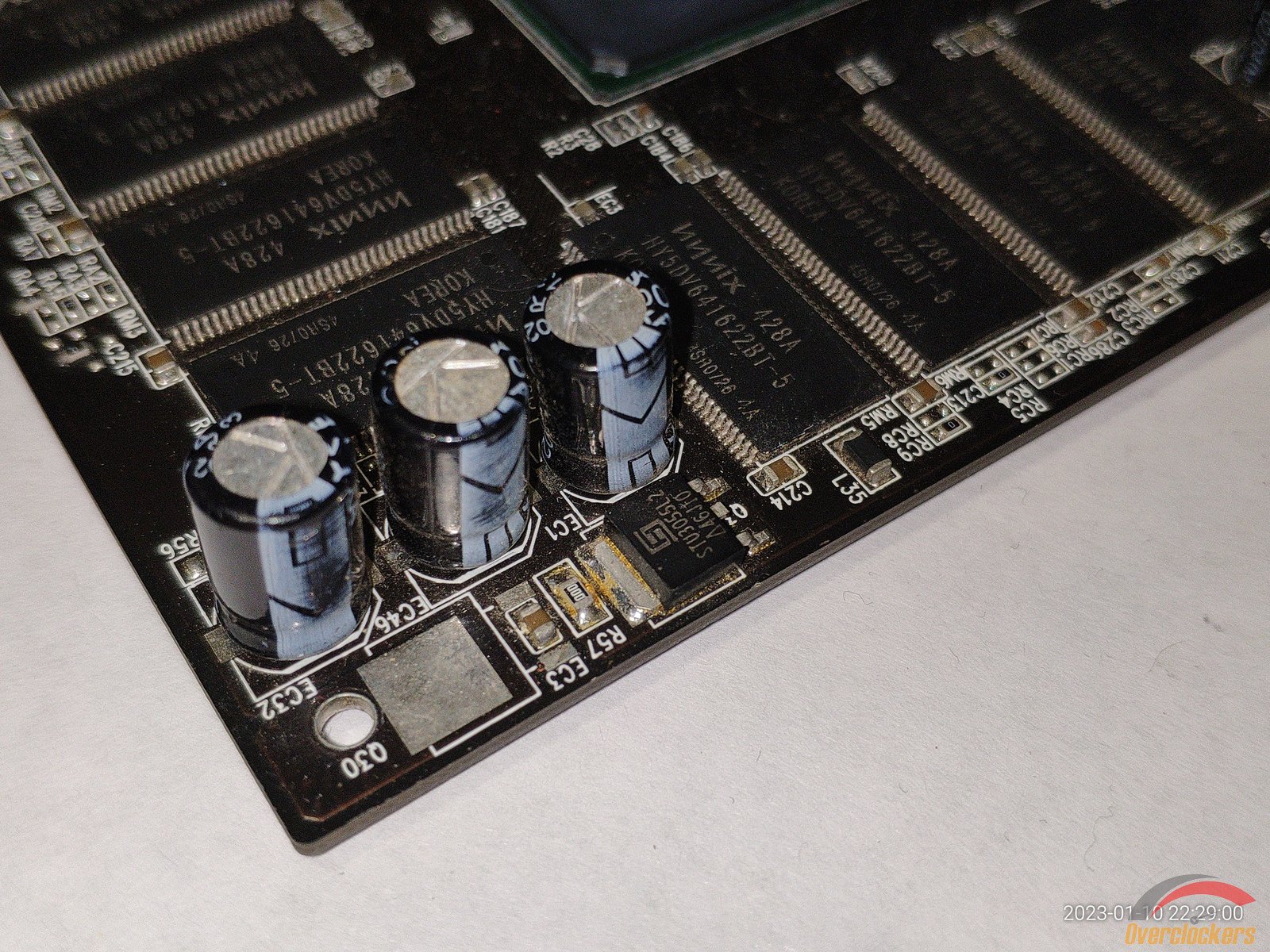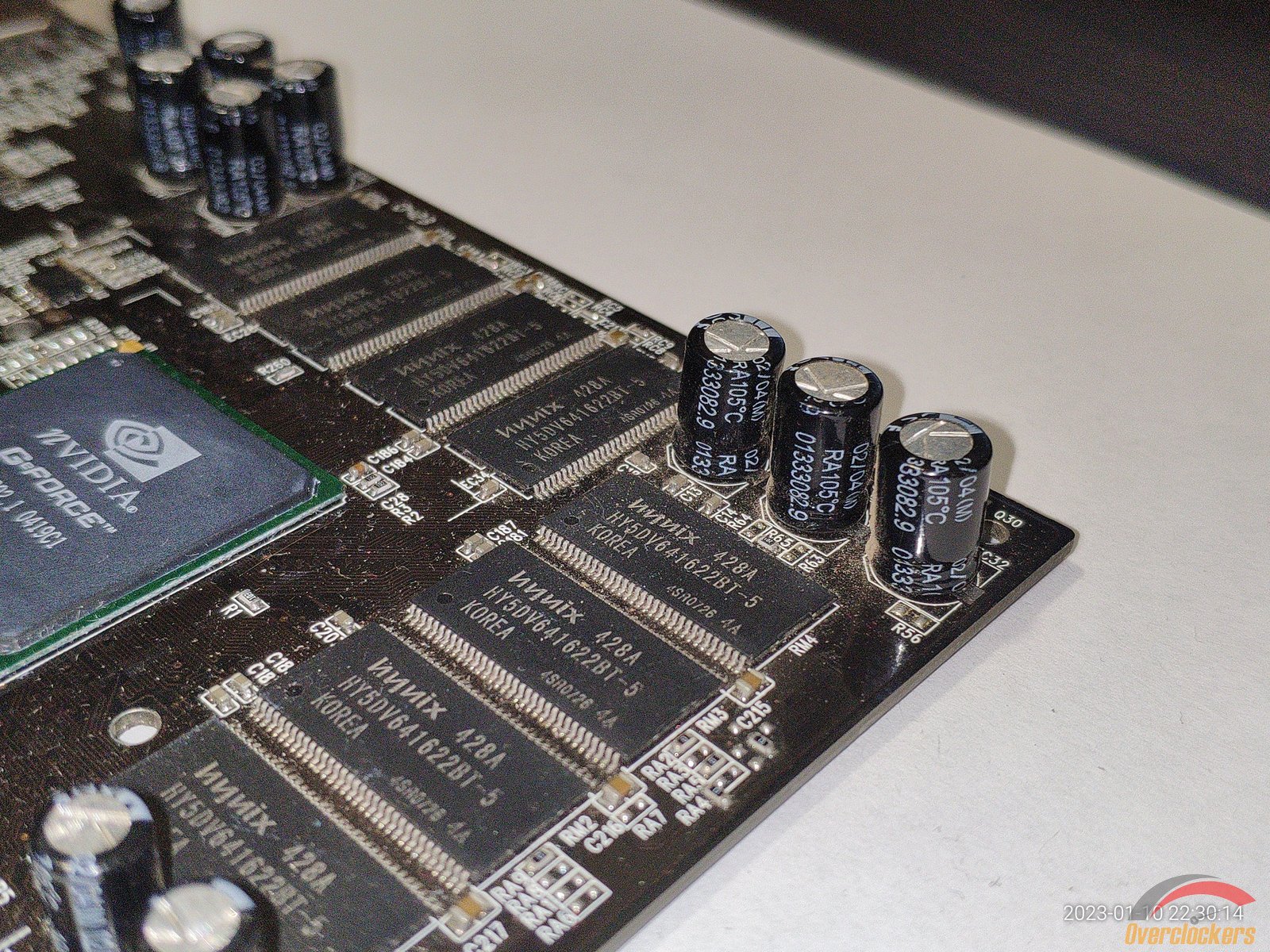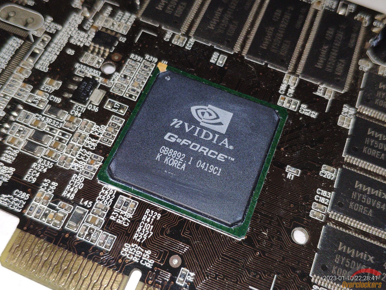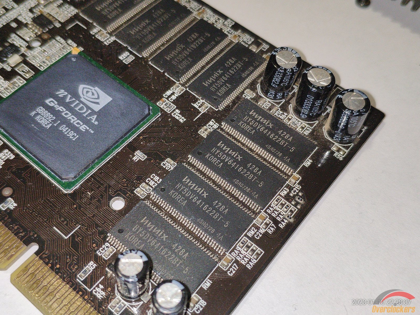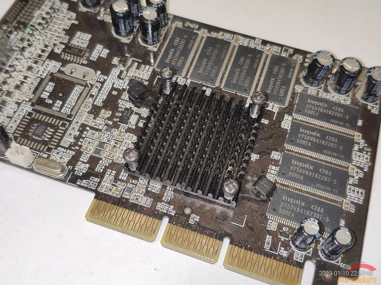 На плате распаяно 8 чипов памяти Hynix HY5DV641622BT-5, чипы рассчитаны на частоту 200 МГц, но фактически работают на частоте 250 МГц по спецификациям на видеокарту, довольно забавно, ведь у ATI Rage 128 Pro наоборот чипы памяти были установлены с большим запасом по частоте, а у GeForce 4 MX440 по сути в заводском разгоне.