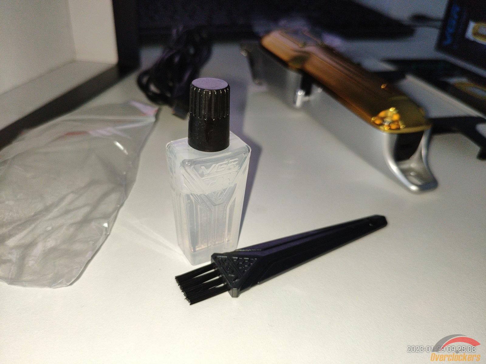 Из комплектации есть сам триммер V-919, три насадки и одна заглушка для хранения триммера, маслёнка с маслом и кисточка для смазки лезвия триммера, инструкция и длинный USB Type-C кабель.