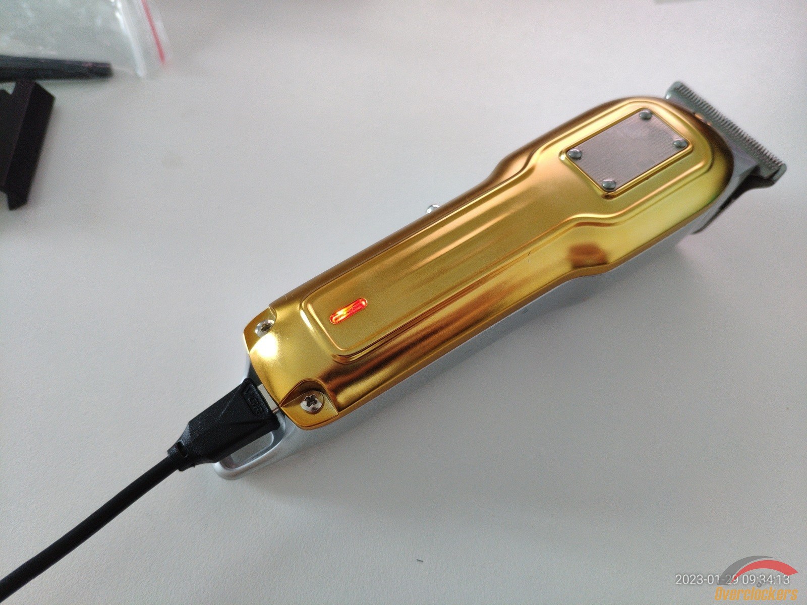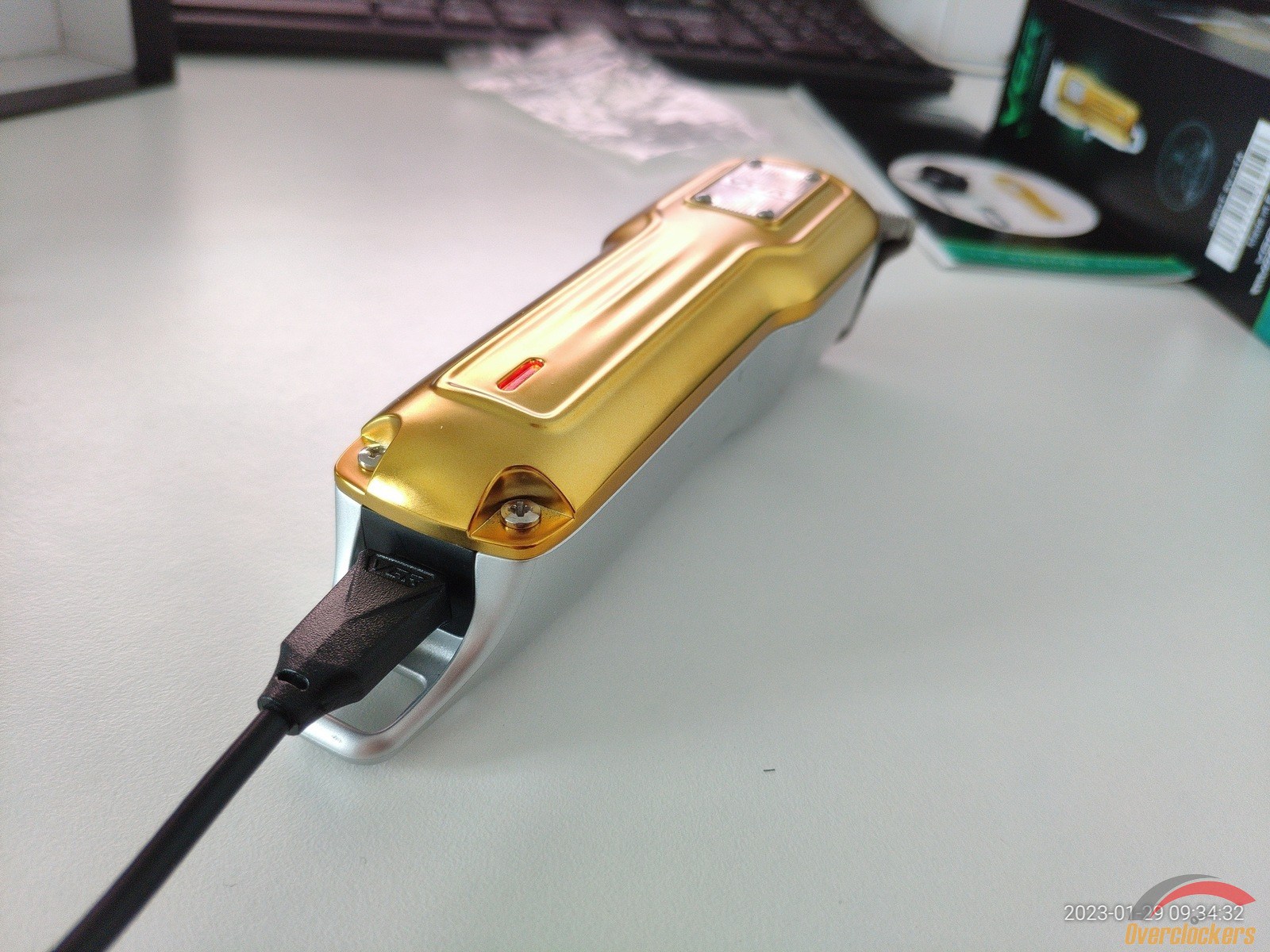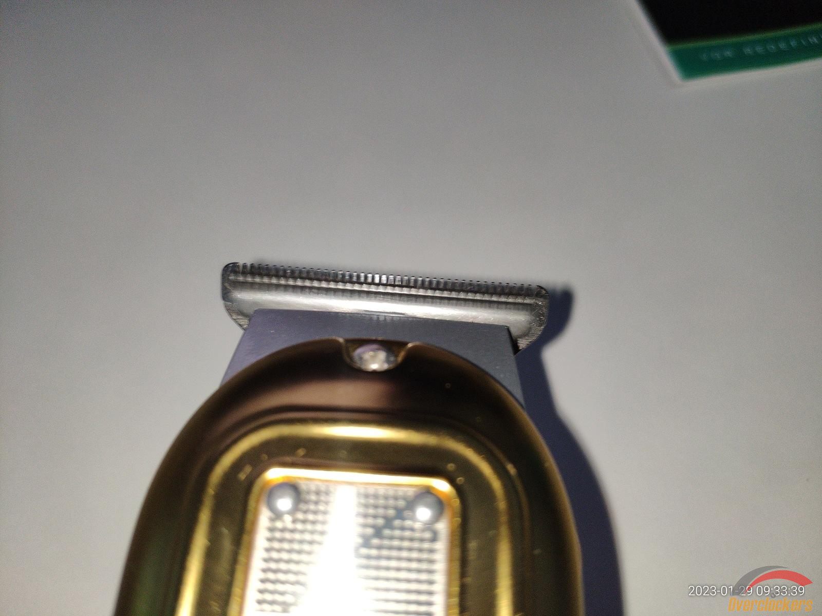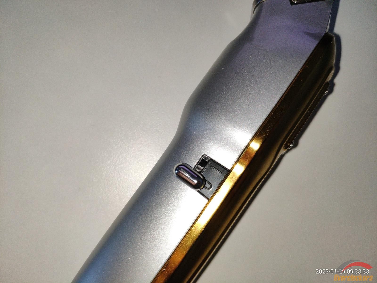 Вот и сам триммер, корпус сверху золотистый, блестит, логотип на месте и закреплен заклепками, с одной стороны выглядит как игрушка благодаря блеску, но с другой стороны мне понравился не только внешний вид, но и рельеф корпуса, его удобно держать.