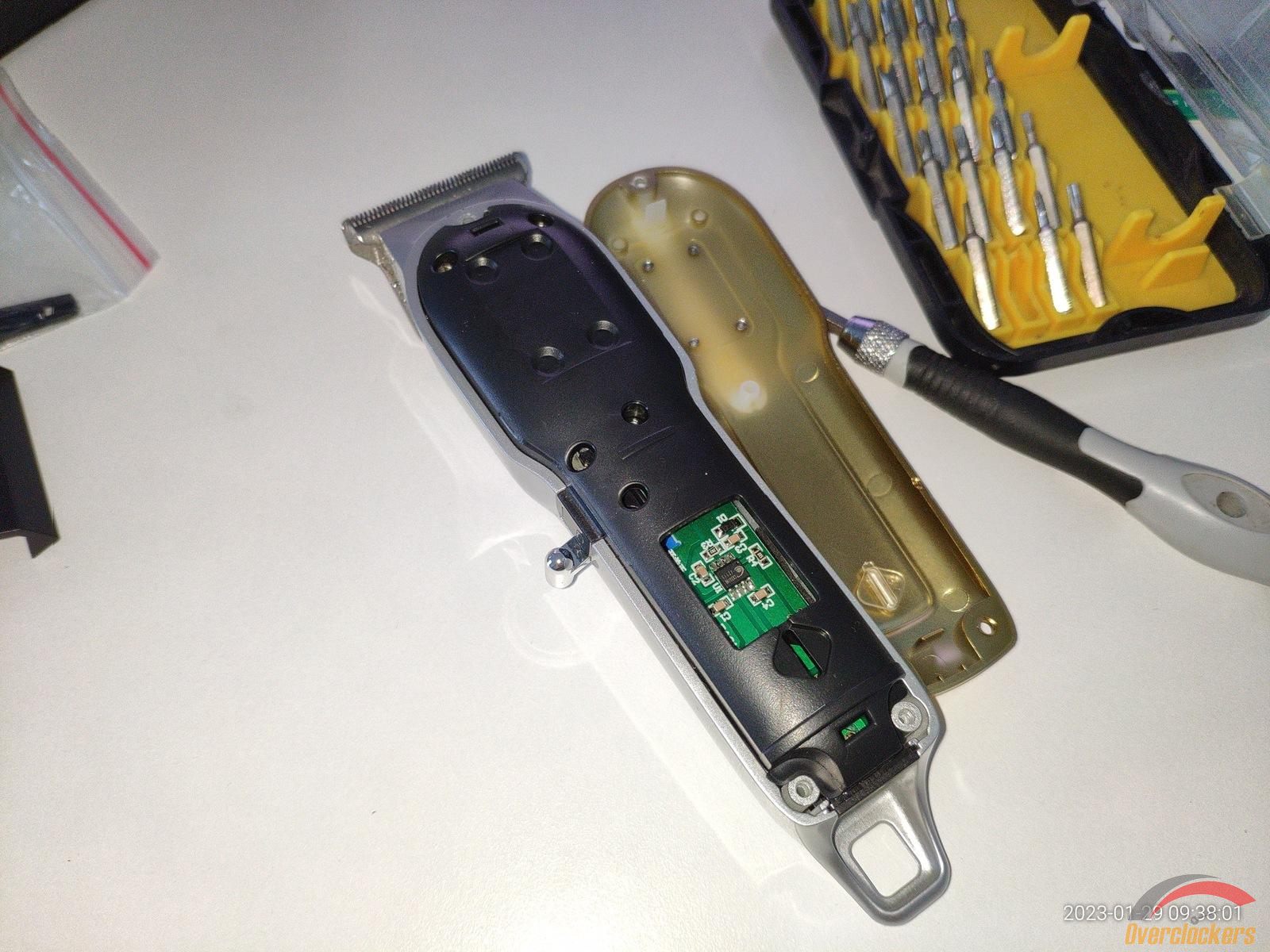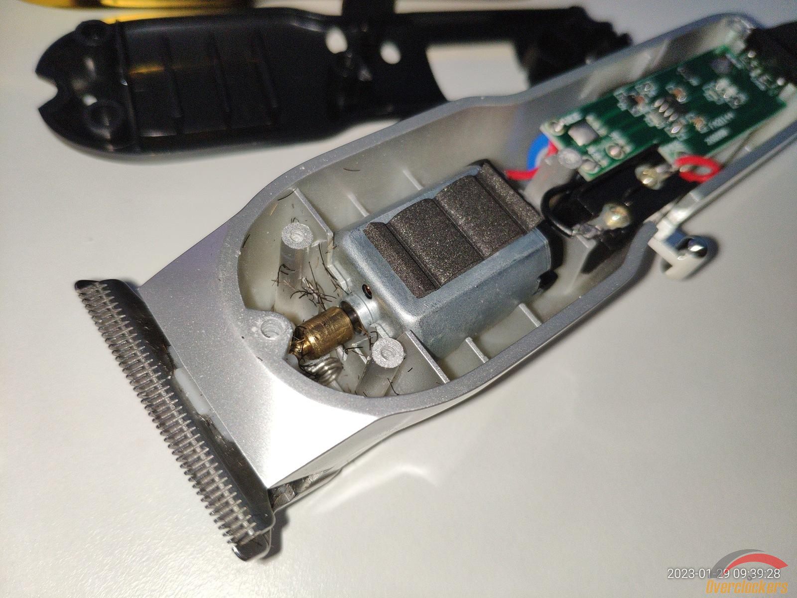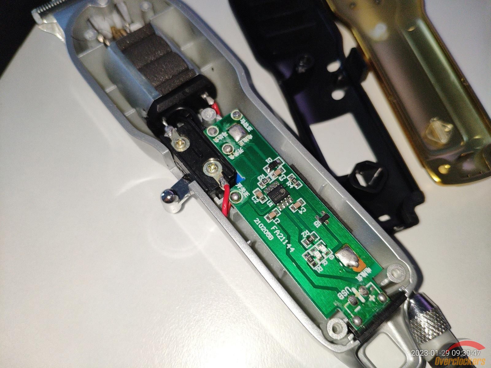 Видно, что производитель хотел защитить начинку от попадания волос, но один волосок все же проник в зону электроники, а значит стыки не герметичные, впрочем, за стоимость этой машинки простительно, тем более волосок мог упасть во время снятия крышки, главное, что можно самому доработать чтобы наверняка ничего не попало внутрь в собранном состоянии, полоску силиконового герметика намазать по швам и закрыть, ничего сложного.