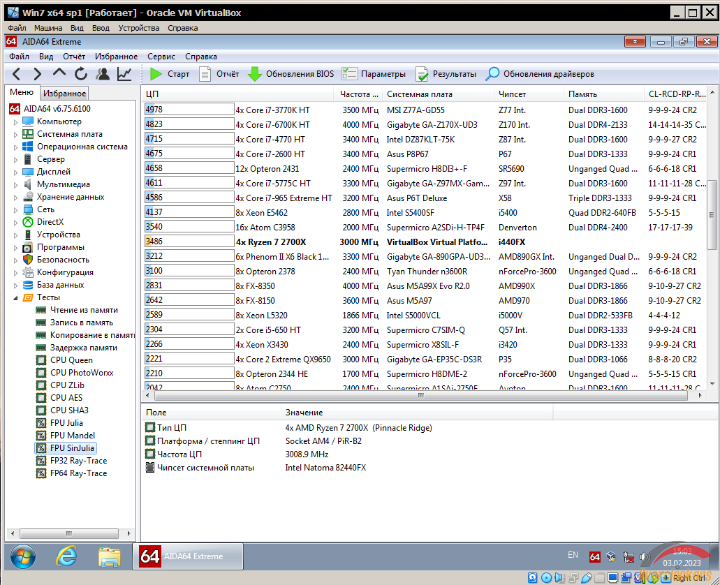 Вот и очередное слабое место процессоров Intel, FPU SinJulia, и этот тест очень не любит когда обрезают потоки процессору, тем не менее производительность виртуальных машин близка к главной ОС в данном случае, если конечно главная ОС это Windows 7, ибо виртуальная машина запущенная в среде Windows 10 показывает заметно более низкую производительность.