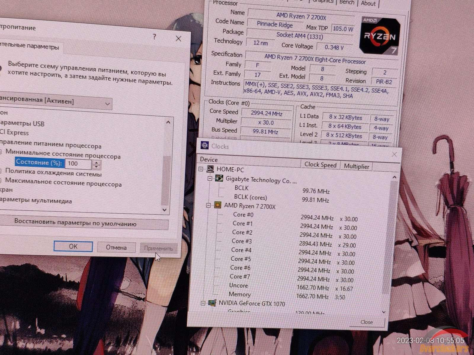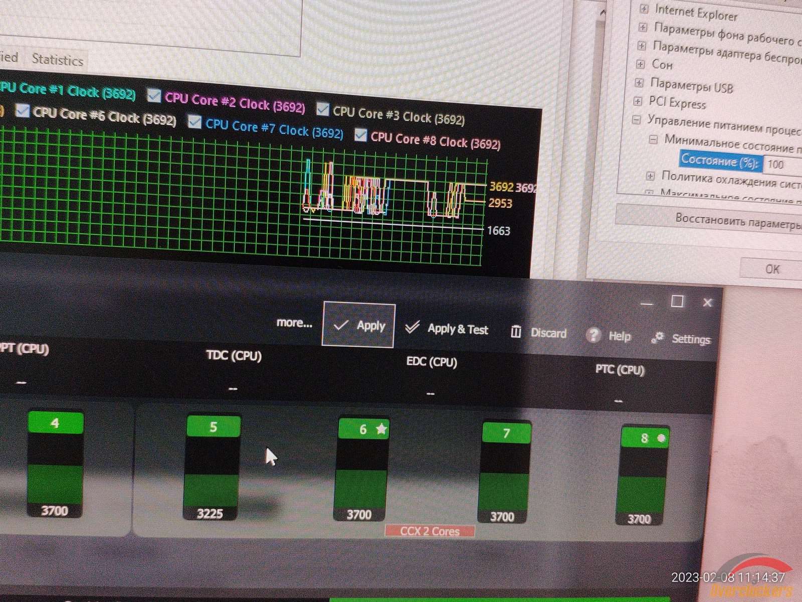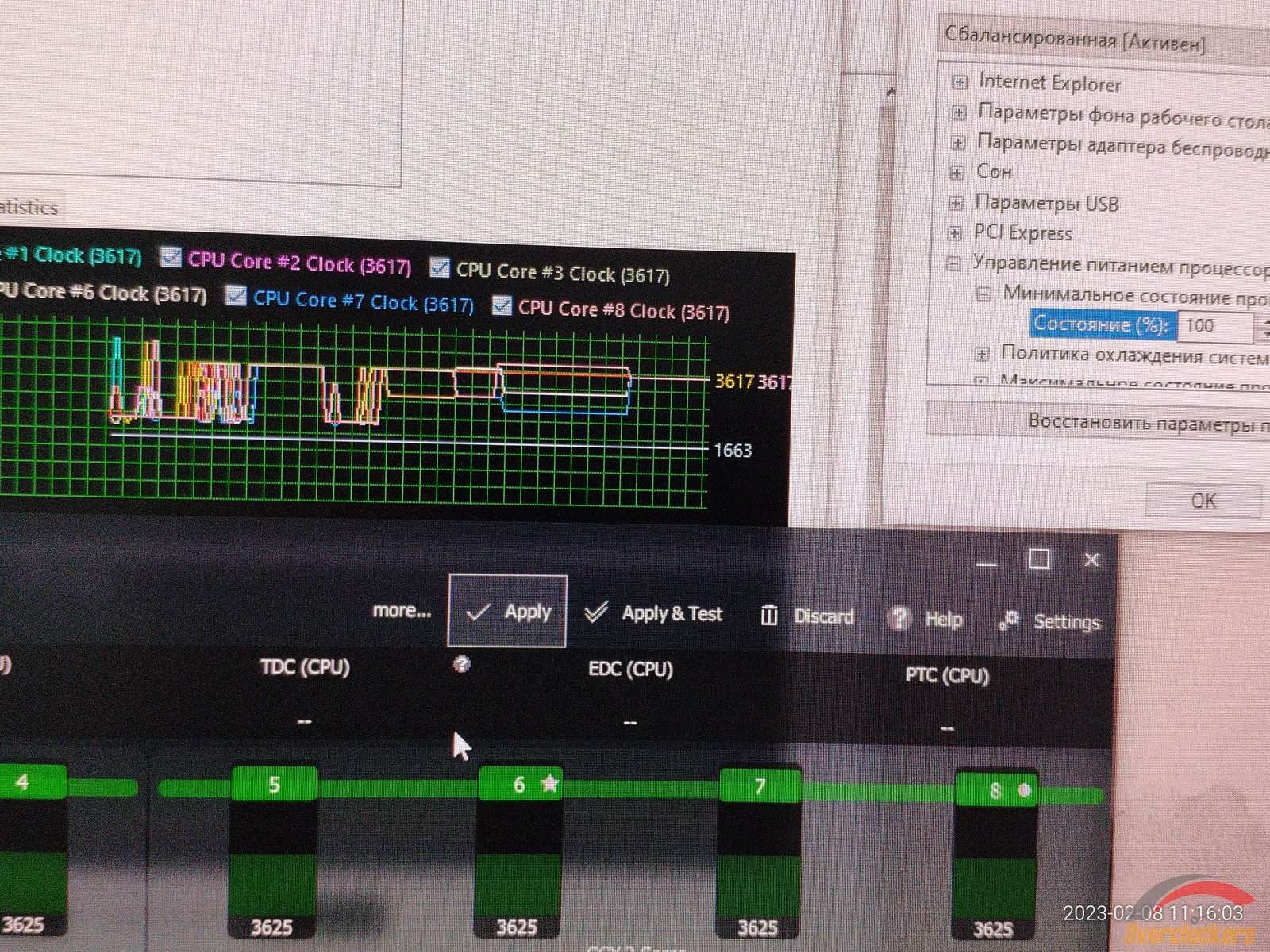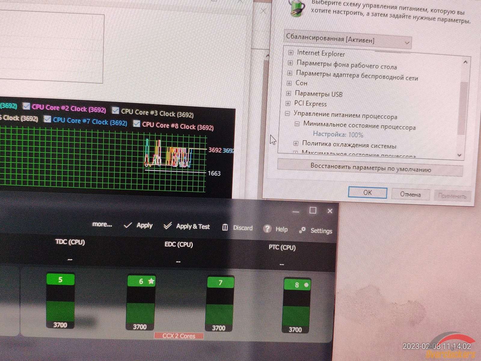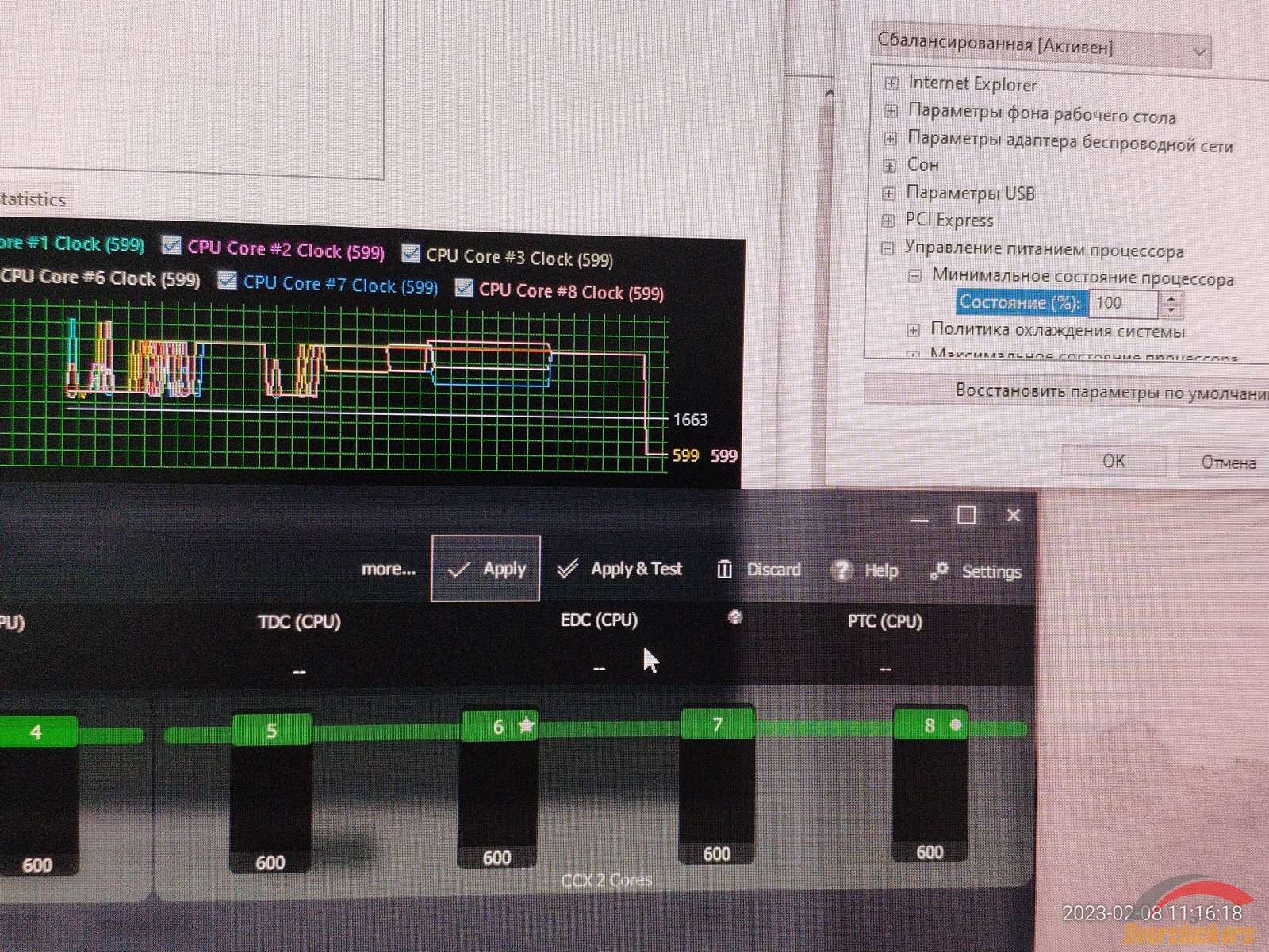 Теперь проверка на работу функций электропитания Windows при запущенном Ryzen Master, в случае Windows 7 установка 100% для минимального состояния ЦП заставляло процессор работать на максимальной частоте по всем ядрам, но в Windows 10 происходит какой-то хаос, частоты плавают как попало, и это плохо, в Windows 10 я не могу зафиксировать частоту ядер на максимальной без нагрузки, ибо работает неправильно все, когда в Windows 7 работало правильно.
