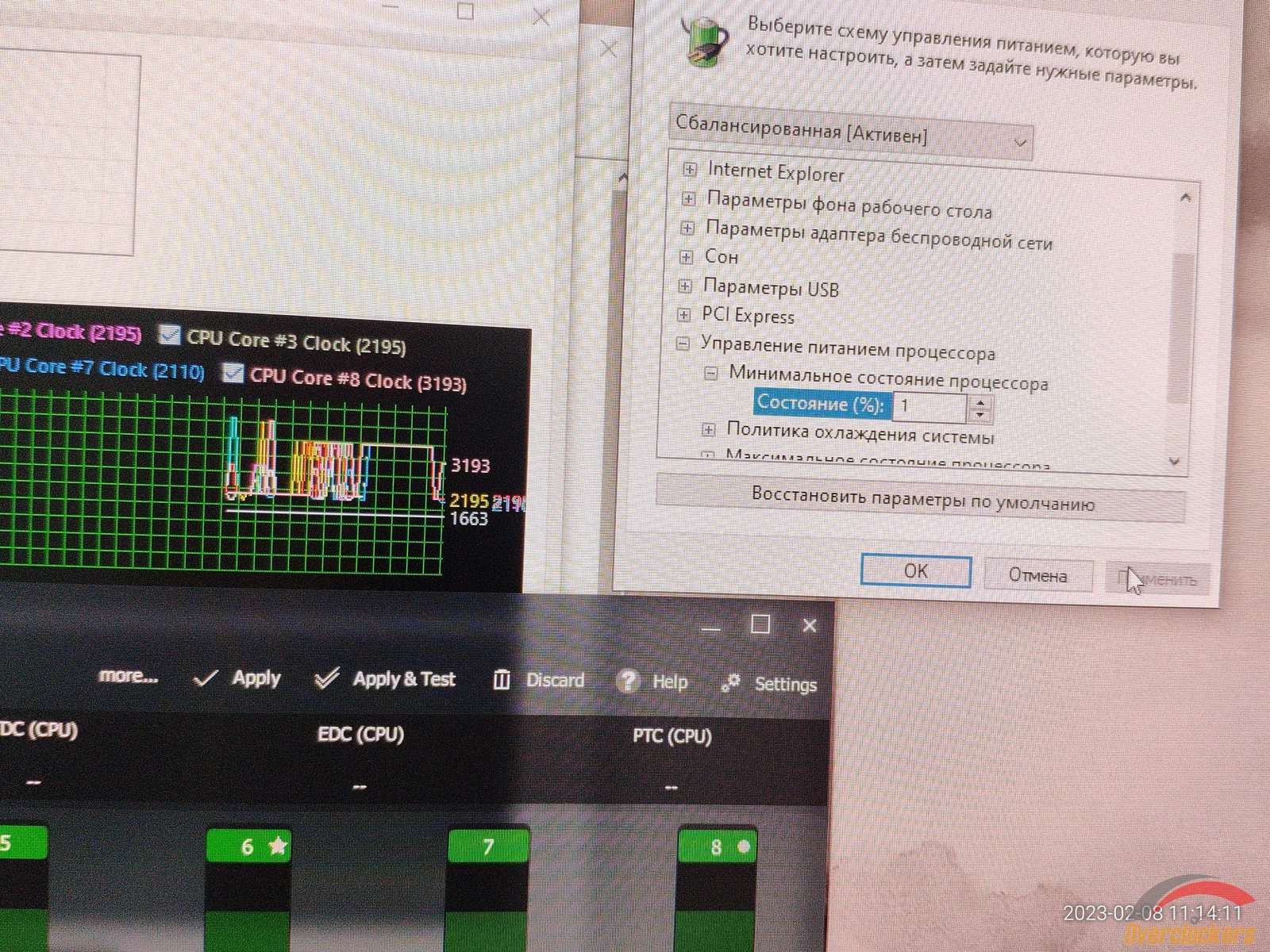 Начну пожалуй с того, что проверю поведение процессора с разными настройками электропитания, и чуда не случилось, Windows 10 работает ничем не лучше Windows 7 в этом плане, минимальное состояние ЦП не заставляет процессор работать на своей максимальной частоте по всем ядрам без нагрузки.