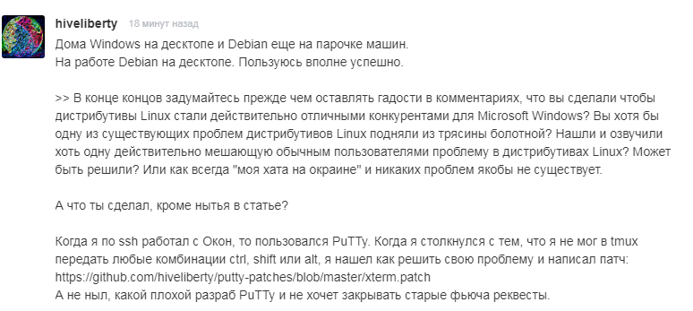 Обычный пользователь установит "свободную ОС", посмотрит на бесконечные запросы root пароля которые никак не отключить из GUI да прочие проблемы на ровном месте, и уже будет не до исправления каких-то там PuTTy, может быть полезет на форум просить помощи, получит в ответ "ты просто глупый вендузятник", и уйдет обратно в Windows... И так пока все по кругу не "попробуют", а там уже скажешь про Linux и все такие "Фу! Иди ты со своим линуксом подальше!".
