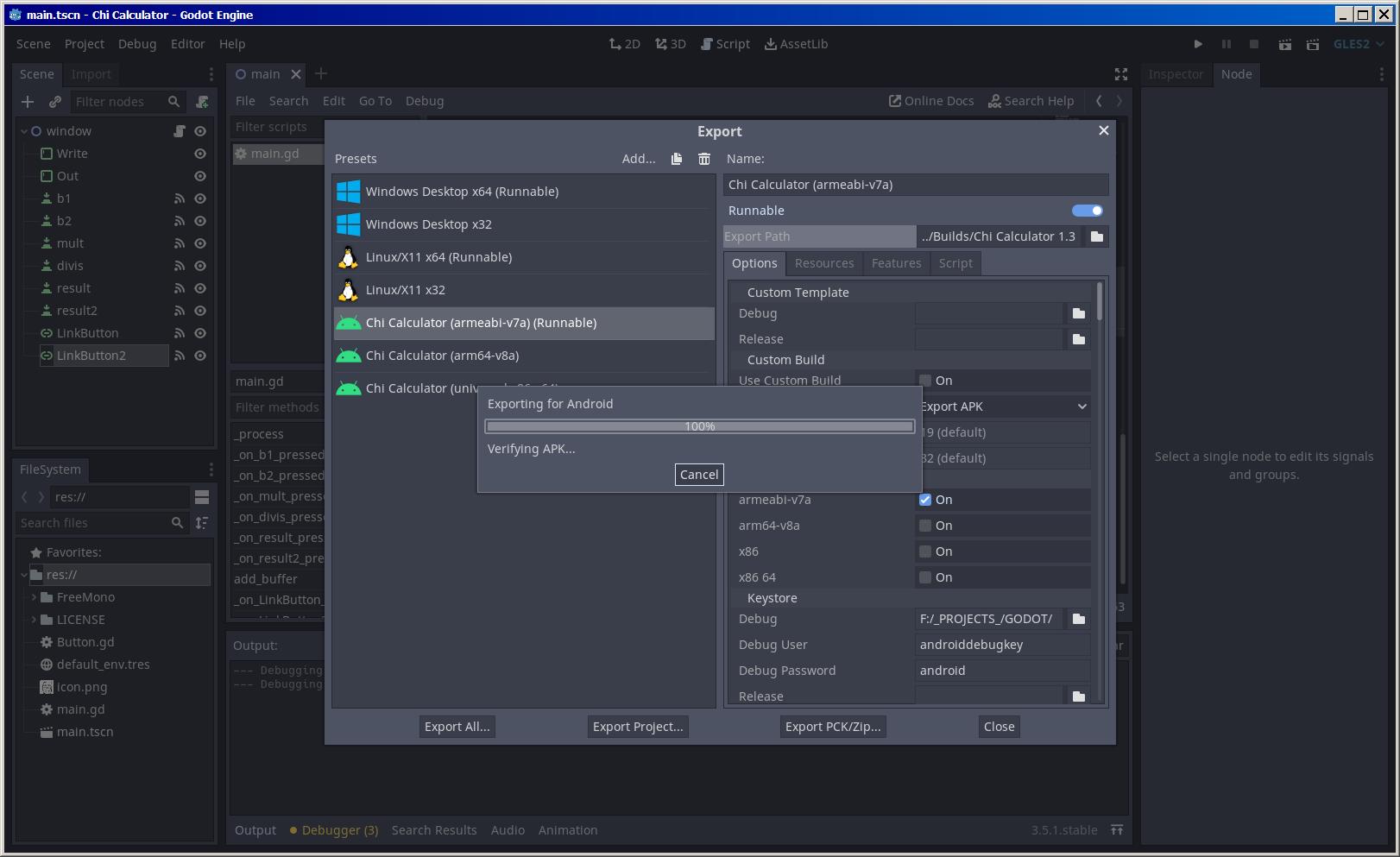 Сейчас у меня настроен экспорт для Windows (x32/x64), Linux (x32/x64), Android (ARMv7, ARMv8, x86, x86_64).