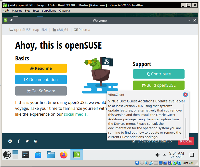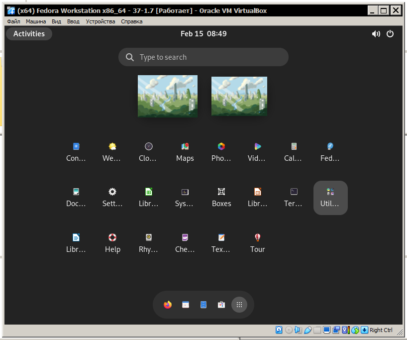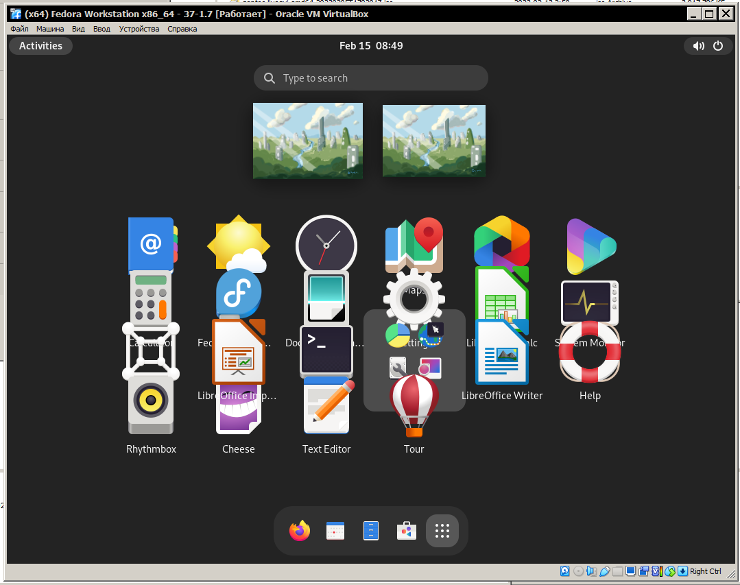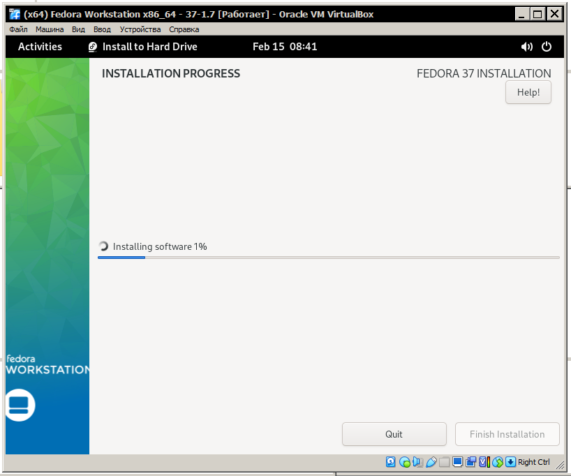 С Fedora 37-1.7 тоже не задалось... Она явно не очень хорошо дружит с разрешением 800x600, а еще Fedora сама установила дополнения VirtualBox (кто её просил?), в итоге растянув окно виртуальной машины и Fedora растянулась, правда вот лучше бы она этого не делала...