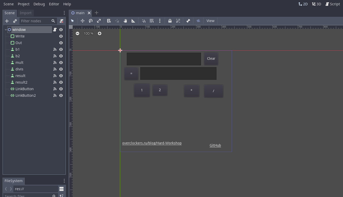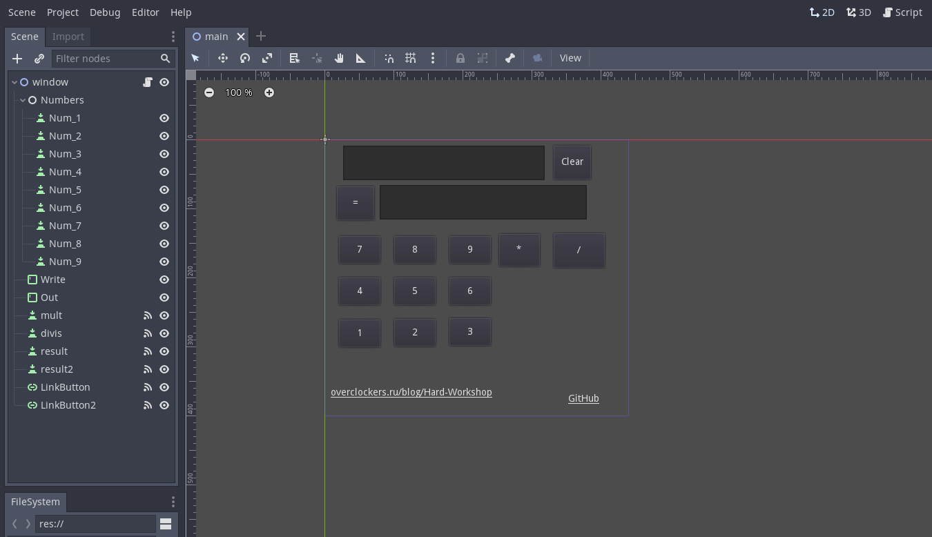 На данный момент у калькулятора работают все цифры, работает умножение и деление, а так же сброс ввода, и работает это всё через клавиатуру, нажимать кнопки мышью бесполезно, сейчас это просто "шаблон" над которым нужно поработать.