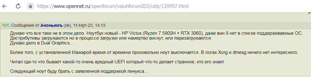 Хотя как показывает практика, не только у меня были серьезные проблемы с дистрибутивами Linux на современном ноутбуке, у меня были проблемы с MSI Alpha 15 (Ryzen 7 4800H + RX 5600M), тоже все дистрибутивы намертво висли и не загружались, только одна Ubuntu заработала едва, и то криво работала с монитором подключенным к дискретной видеокарте...