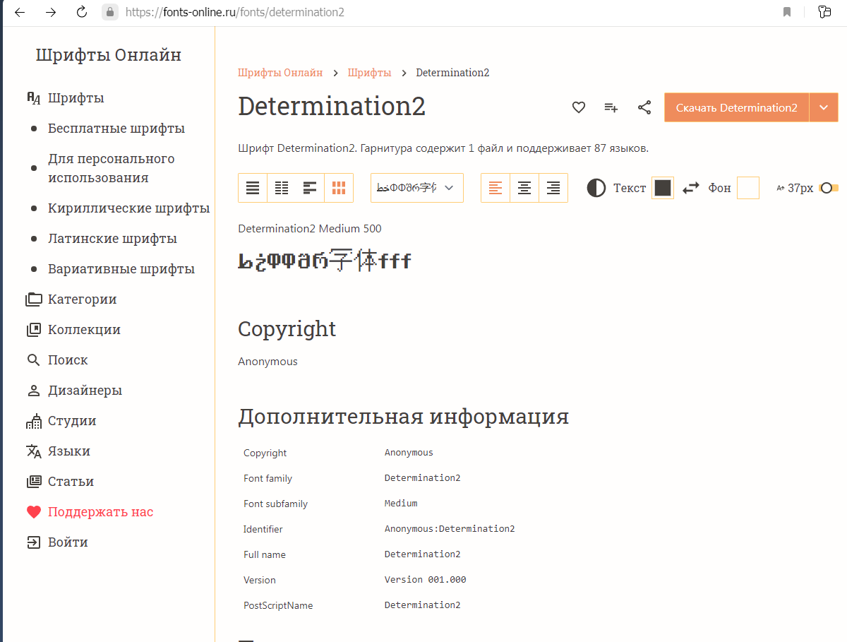 В итоге я решил подойти к проблеме с другой стороны, было бы хорошо одним шрифтом поддерживать все языки, но суровая реальность не позволяет, потому я просто задействую Determination2 в качестве основного шрифта, и предоставлю пользователю возможность выбрать свой шрифт.