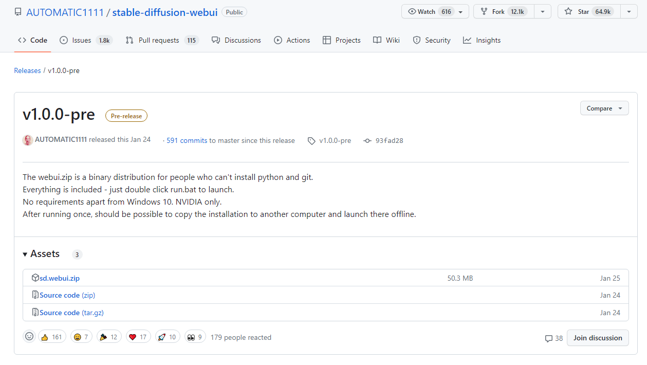Внимательные могли заметить один "пре релиз" в репозитории "AUTOMATIC1111/stable-diffusion-webui", мол уже готовые для использования файлы, даже Python и Git не надо устанавливать! Звучит круто, и я действительно это заметил только сейчас. Правда меня смущает одна строчка в конце "After running once...", и она гласит, что после первого запуска можно скопировать приложение на другой ПК и запустить без интернета.