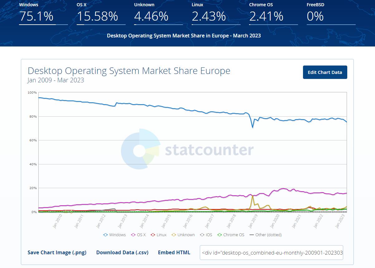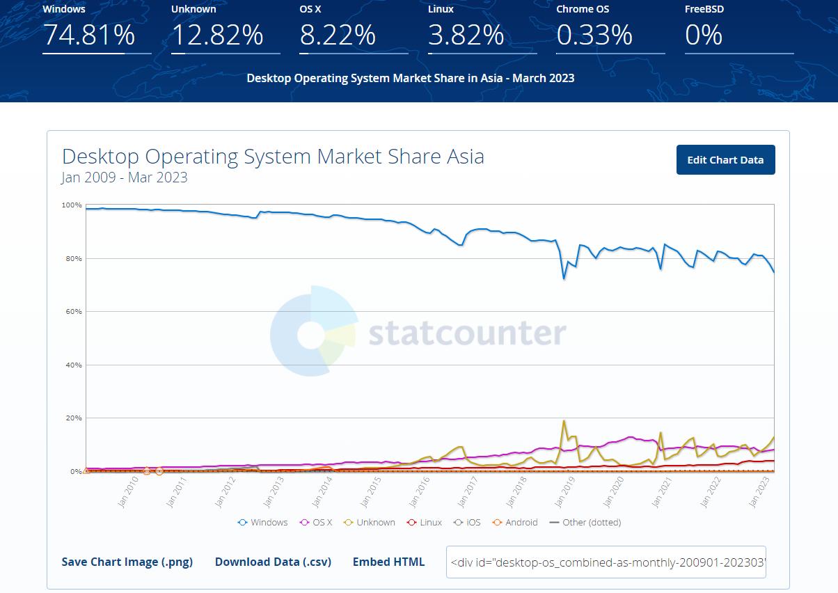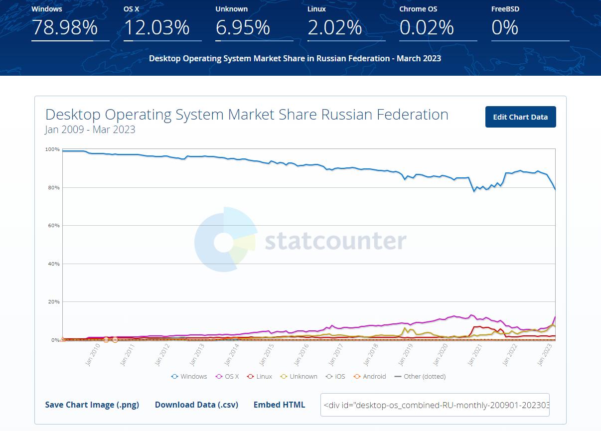 Вроде кто-то и пробует перейти на дистрибутивы Linux, но в реальности только доля ОС от Apple действительно выросла, а Linux дистрибутивы вроде и растут, но в каких-то конвульсиях, и то эти "конвульсии" идут из азиатского региона в основном, интересно, почему же так выходит?