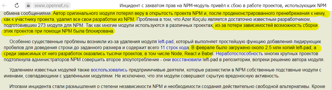 Я уже не буду здесь подробно говорить про подмену зависимостей в репозиториях злоумышленниками, и про случаи, когда зависимости просто удаляют из репозиториев, от чего страдают тысячи проектов в которые был вложен труд массы людей...
